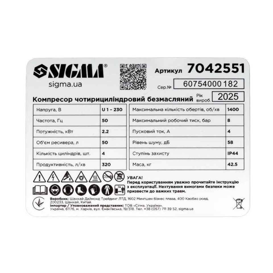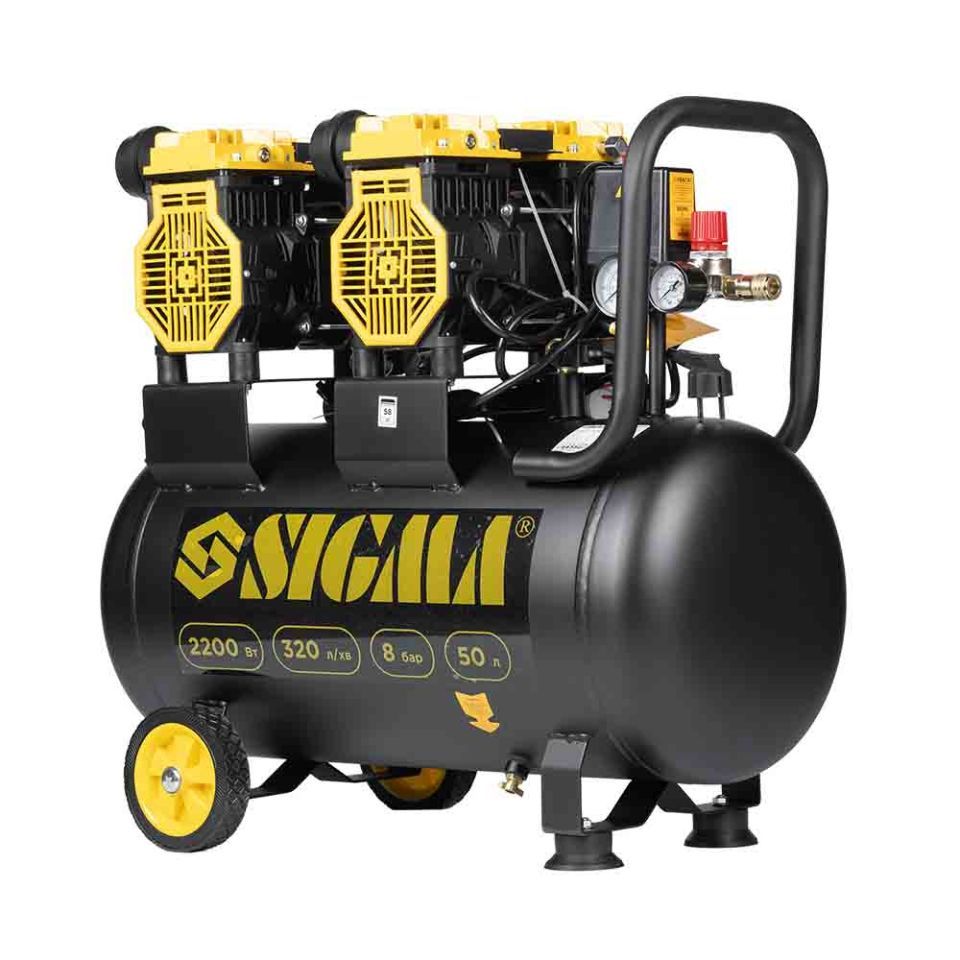 Компрессор четырехцилиндровый безмасляный 2.2кВт 1400об/мин 320л/мин 8бар 58дБ 50л SIGMA (7042551) предназначен для нагнетания сжатого воздуха с последующей его подачей под давлением в различные типы пневмоинструмента.