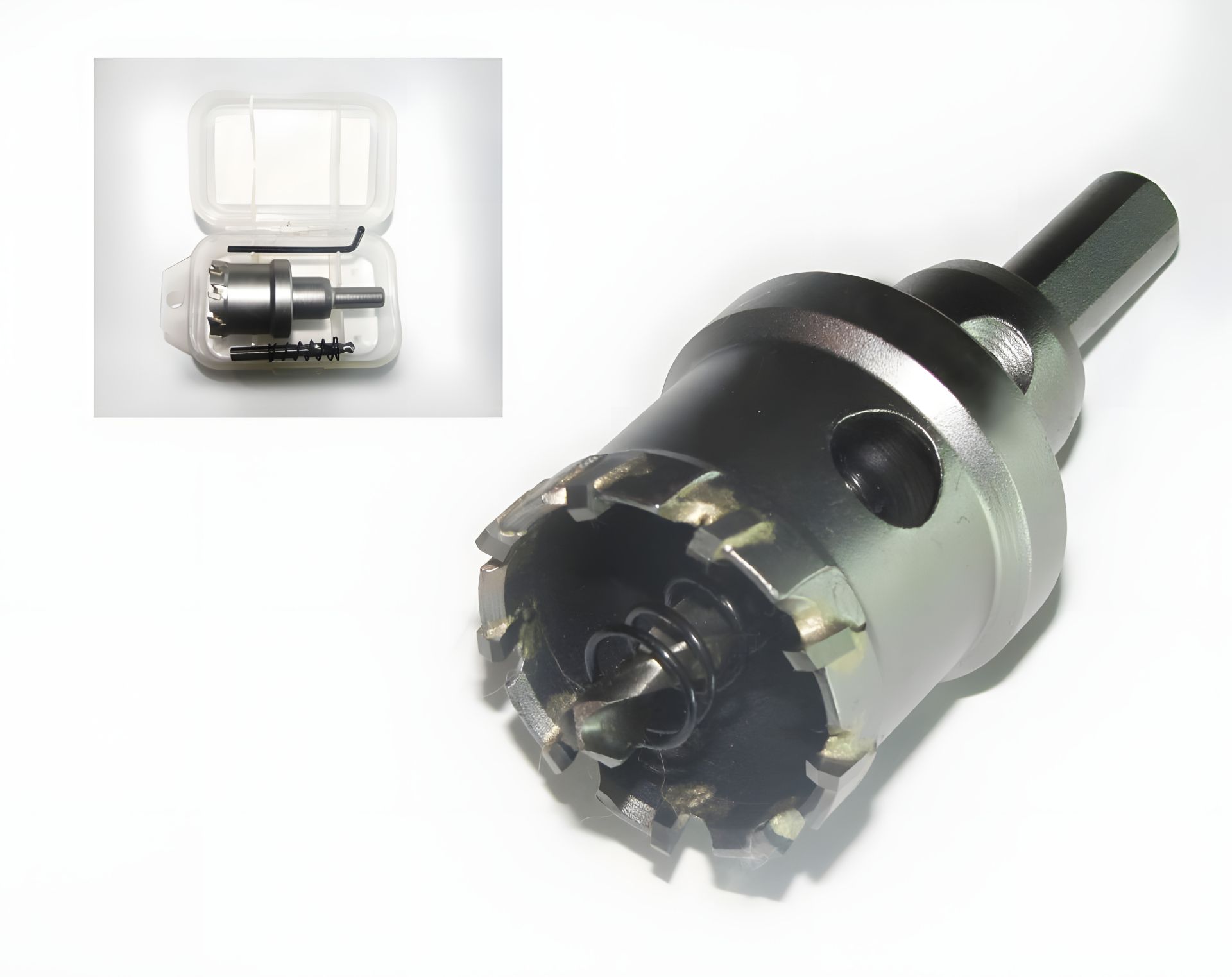 Коронка универсальная преднозначена для сверления отверстия в сталях различных марок.Может использоваться для сверления отверстий в мраморе,керамике,граните и кирпиче.В этом случае необходимо снять центровочное сверло.Твердосплавные резцы,расположеные по кромке коронки,заточены под разными углами тем самым обеспечивают качественные режущие свойства.