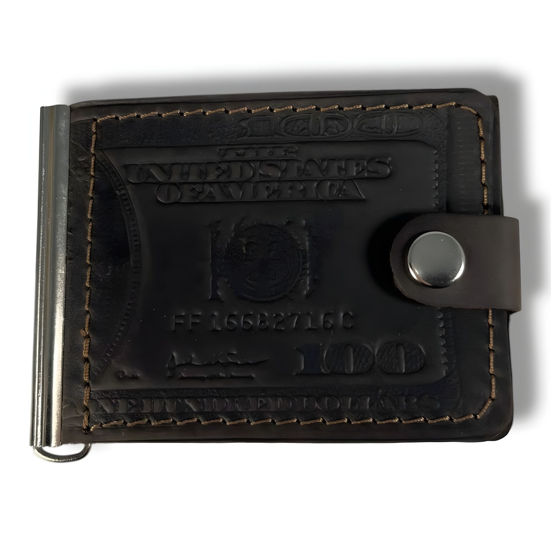 Кошелек зажим для купюр BagWay, экокожа, ручная работа, отделение для купюр, четыре отделения для карточек, одно прозрачное отделение, размер: 10*8*1 см, темно-коричневый с тиснением.