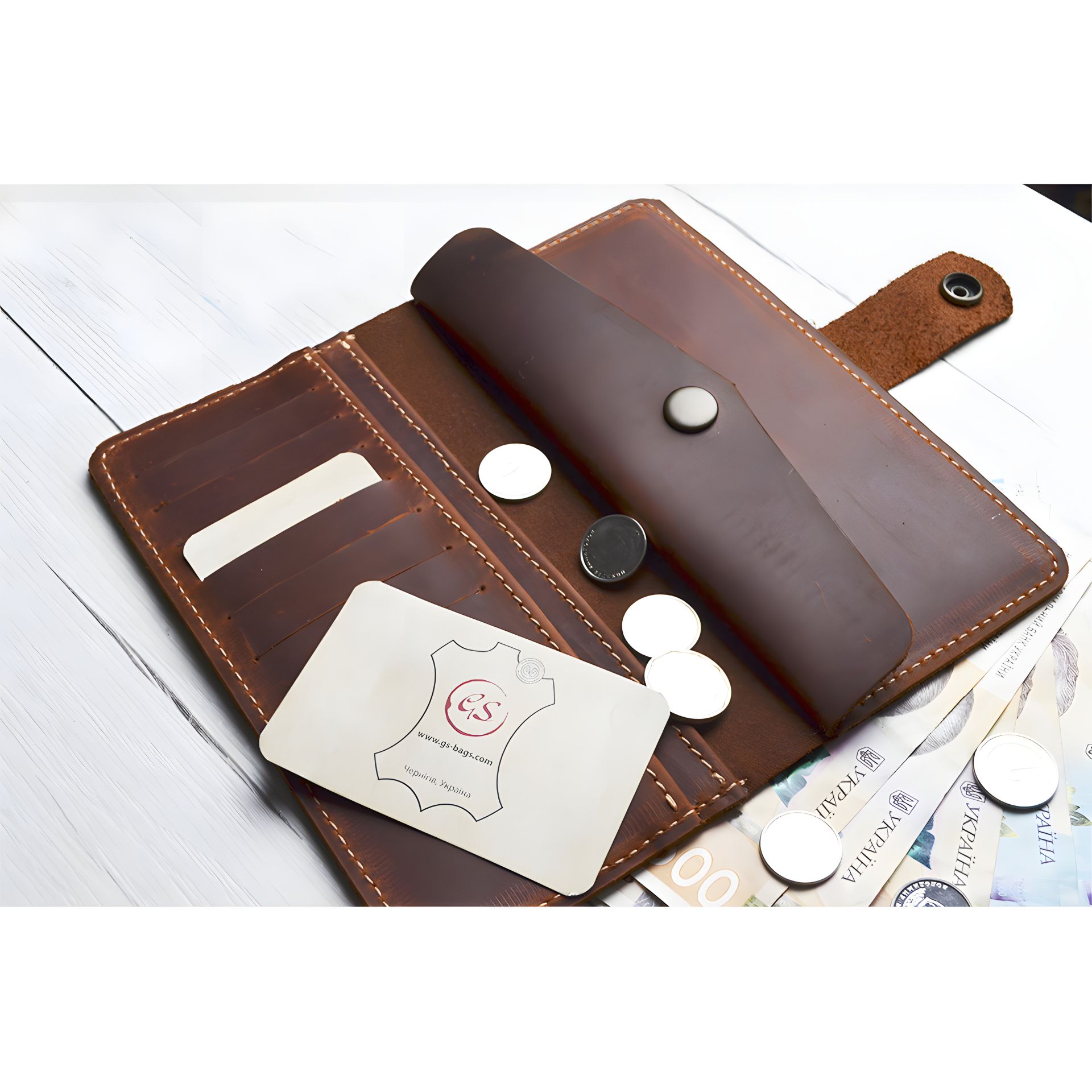 Женский кошелек GS пошитый из высококачественной кожи Crazy Horse имеет три отдела для банкнот, кожаные перегородки в отделах, удобную, вместительную монетницу и семь карманов для карт. Закрывается кошелек хлястиком на кнопке.