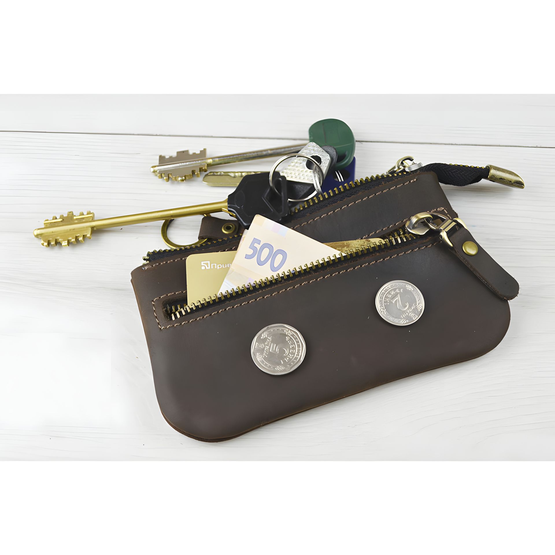 Кожаная ключница GS коричневого цвета. Пошита из натуральной кожи КРС, вощеной, винтажной Crazy Horse ( крейзи хорс) . В ключнице есть основной отдел , в котором легко помещаются длинные ключи до 14 см. На тыльной стороне есть карман на молнии для мелочей .