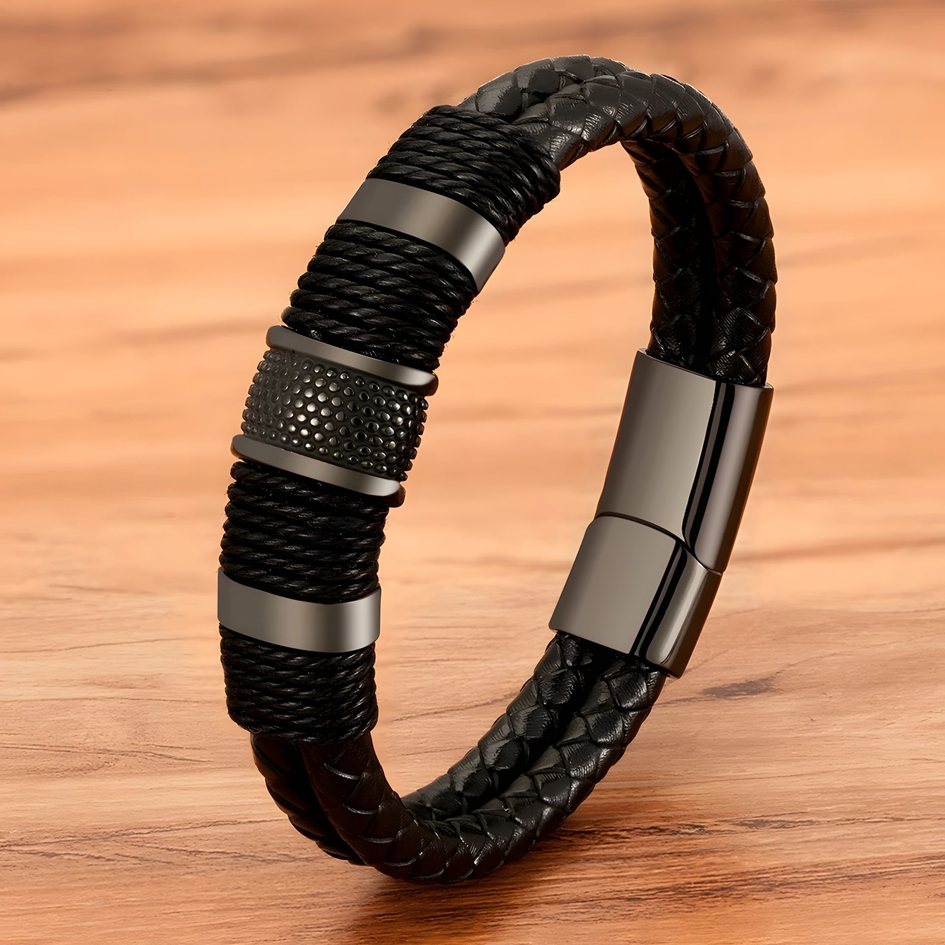 Чёрный кожаный браслет на застежке, плетение мужское/женское
