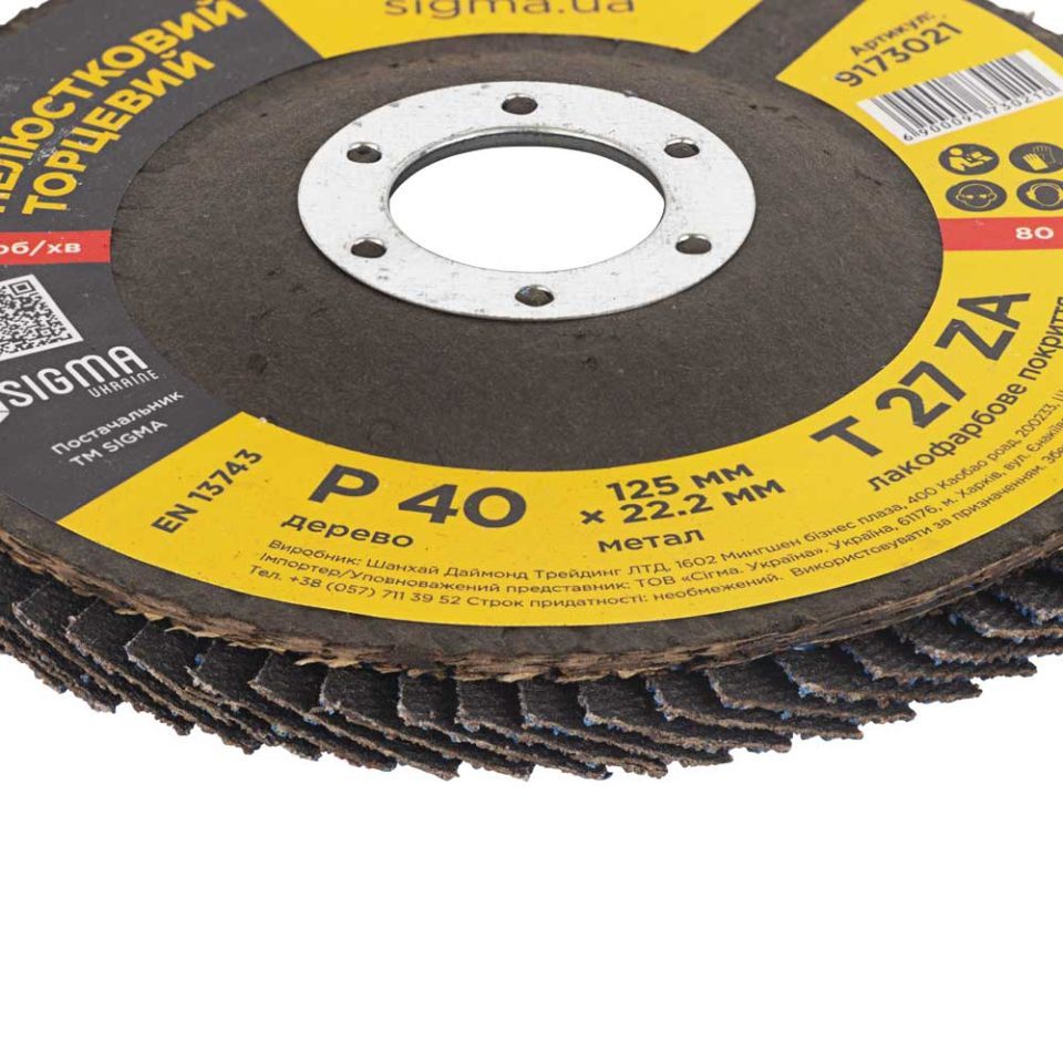 Круг лепестковый торцевой Т27 (прямой) ZA Ø125мм P40 SIGMA (9173021) предназначен для плоского шлифования, обработки кромок сварных швов деталей и конструкций из различных марок сталей, цветных металлов и древесины.