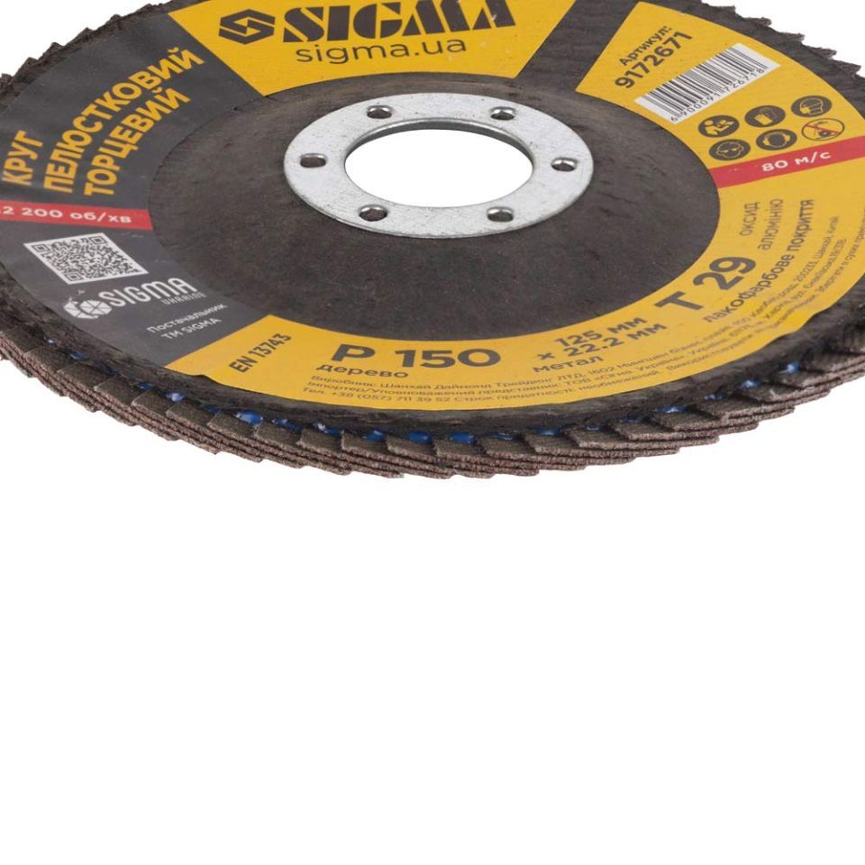 Круг лепестковый торцевой Т29 (конический) Ø125мм P150 SIGMA (9172671) предназначен для плоского шлифования, обработки кромок сварных швов деталей и конструкций из различных марок сталей, цветных металлов и древесины.