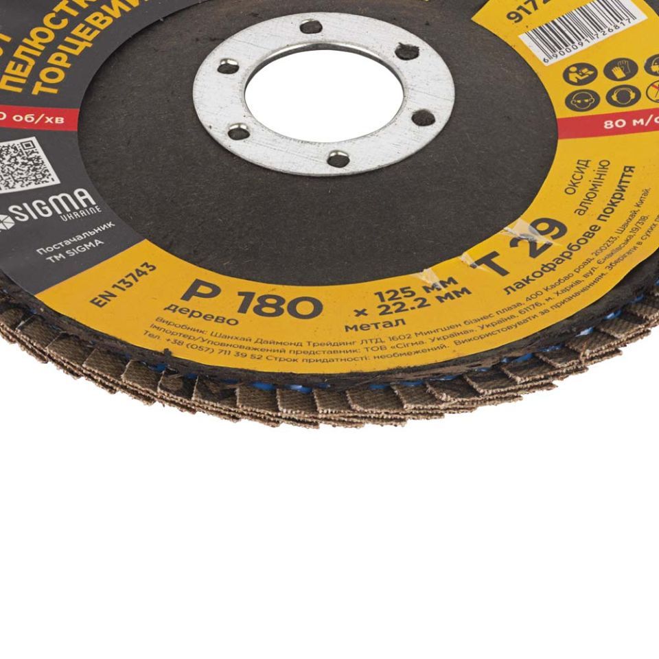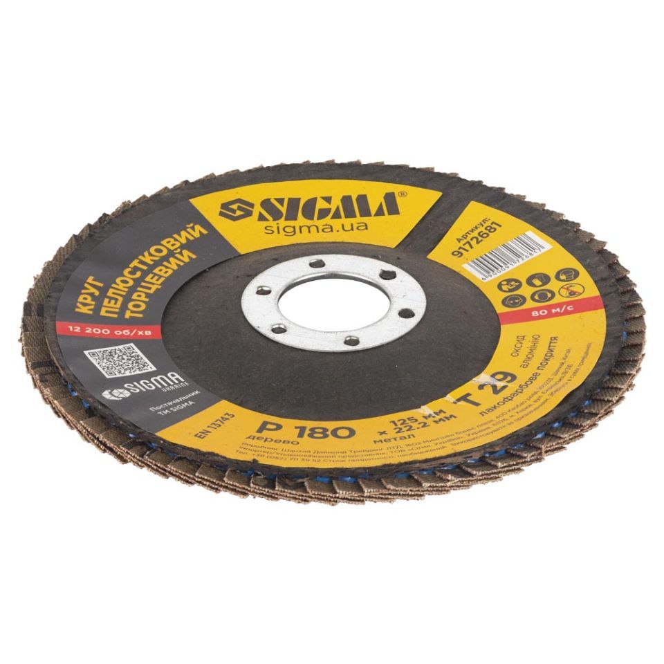 Круг лепестковый торцевой Т29 (конический) Ø125мм P180 SIGMA (9172681) предназначен для плоского шлифования, обработки кромок сварных швов деталей и конструкций из различных марок сталей, цветных металлов и древесины.