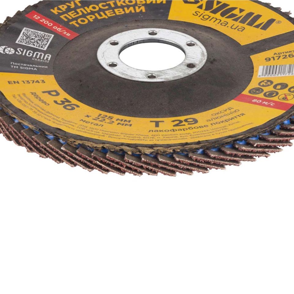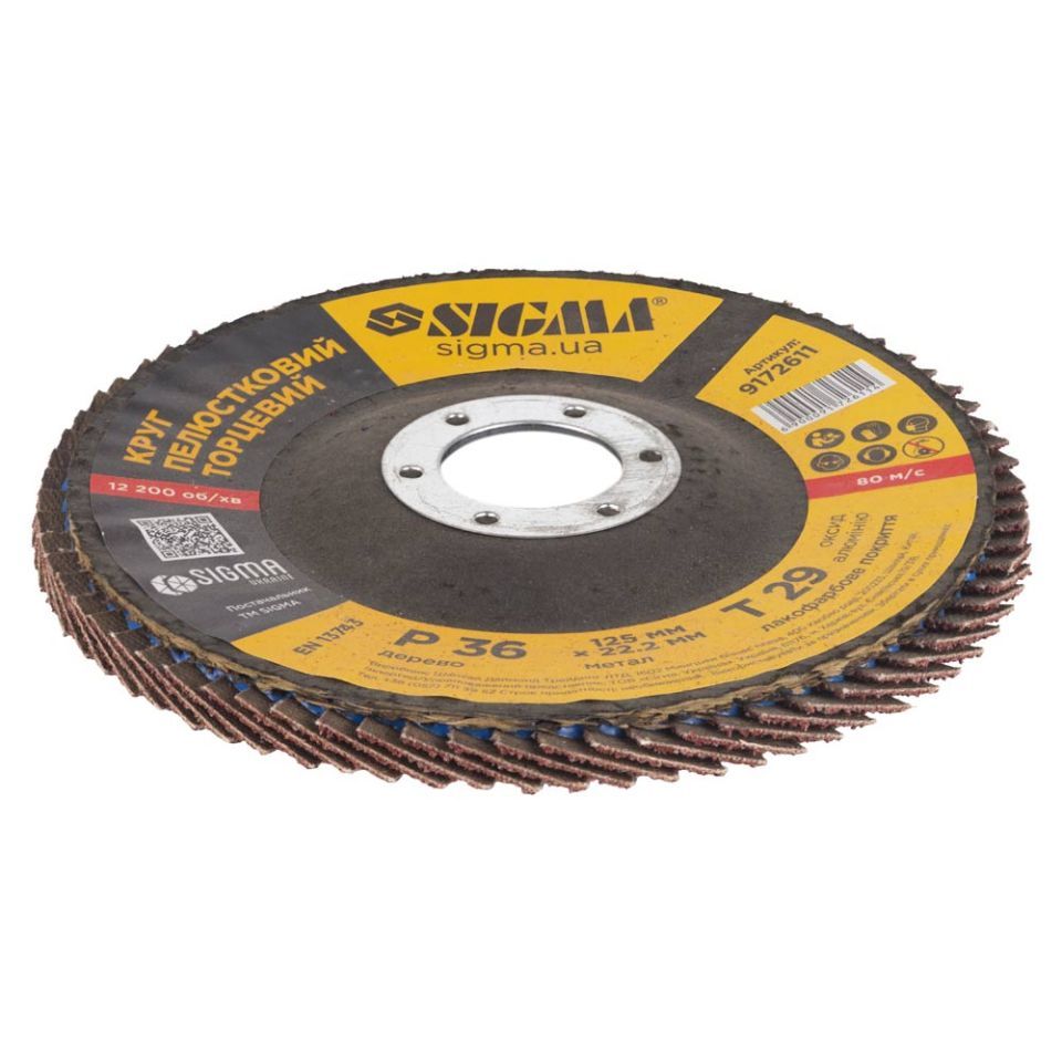 Круг лепестковый торцевой Т29 (конический) Ø125мм P36 SIGMA (9172611) предназначен для плоского шлифования, обработки кромок сварных швов деталей и конструкций из различных марок сталей, цветных металлов и древесины.