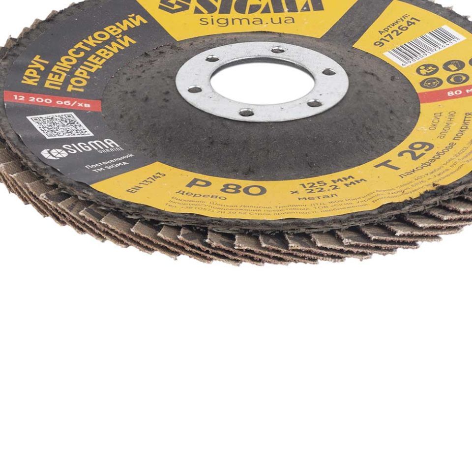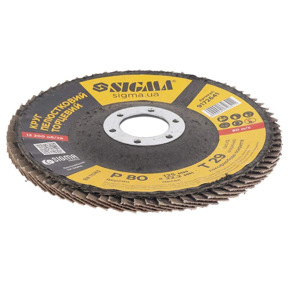 Круг лепестковый торцевой Т29 (конический) Ø125мм P80 SIGMA (9172641) предназначен для плоского шлифования, обработки кромок сварных швов деталей и конструкций из различных марок сталей, цветных металлов и древесины.