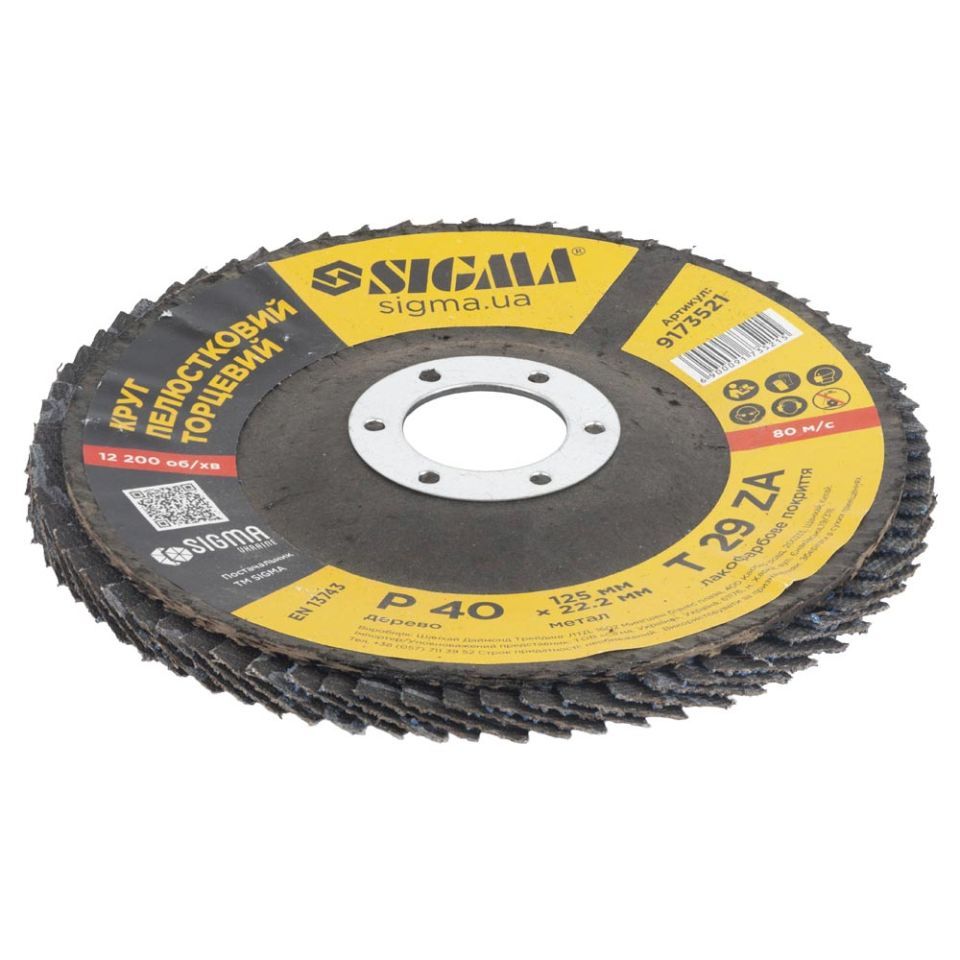 Круг лепестковый торцевой Т29 (конический) ZA Ø125мм P40 SIGMA (9173521) предназначен для плоского шлифования, обработки кромок сварных швов деталей и конструкций из различных марок сталей, цветных металлов и древесины.