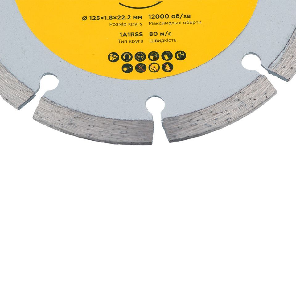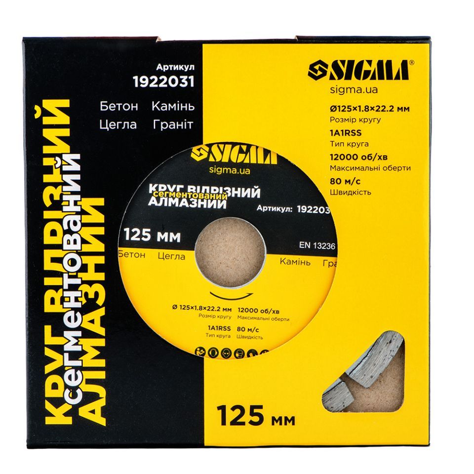 Круг отрезной алмазный сегментированный Ø125×1.8×22.2мм, 12000об/мин SIGMA (1922031) - предназначен для резки бетона, кирпича, бордюрного камня, тротуарной плитки, гранита, черепицы, шифера и других строительных материалов без принудительного охлаждения.