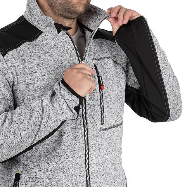 Изготовлена куртка из 100% полиэстера, с прочно прошитыми двойными швами. Она выполнена методом вязки, мягкая и теплая, с плотностью полотна 270 г/м², обеспечивает комфортное ношение куртки в любую холодную погоду, будь то в качестве верхнего или среднего слоя одежды. Накладки черного цвета на плечах и на задней части рукавов гарантируют высокую износостойкость одежды. Куртка соответствует европейскому стандарту качества EN13688.