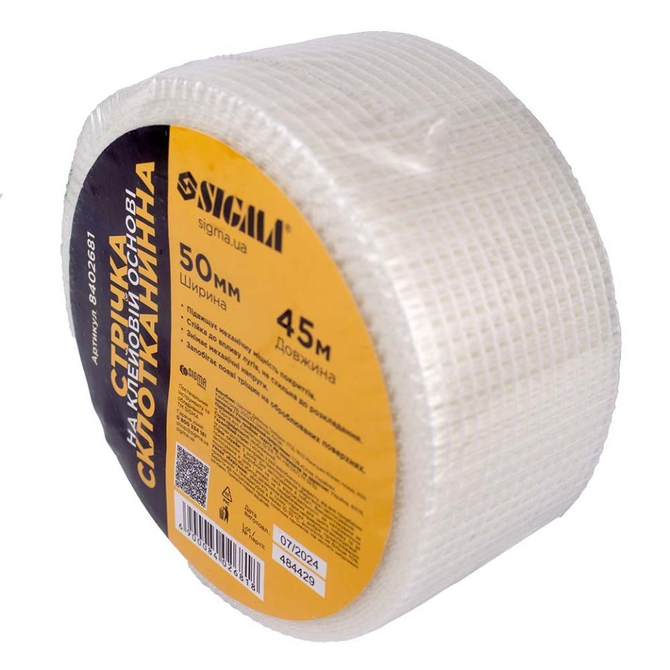 Специальная Лента стеклотканевая на клеевой основе 50мм×45м SIGMA (8402681) используется для предотвращения образования трещин и упрочнения поверхностей.
