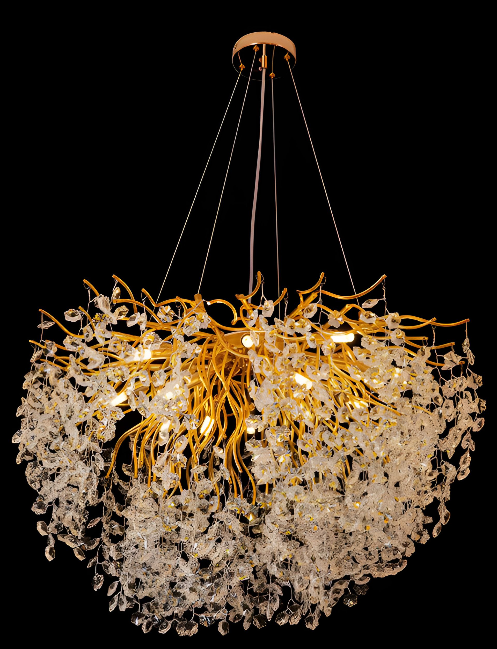 1. Элегантный дизайн: Золотое основание люстры вместе с хрустальными элементами создает изысканный стиль, который подчеркнет роскошь любого помещения.