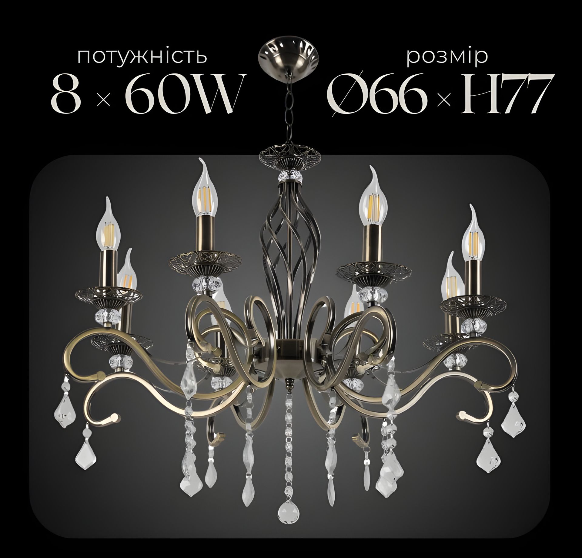 Тип цоколя: E-14 (Миньон) Количество источников света: 8 Длина, мм: 665 Высота, мм: 770 Материал каркаса: металл + стекло Направленность света: вверх Тип крепления: крюк Мощность, W: 60 Назначение: зал Стиль: классические Форма люстры: классический подвес Тип люстры: свечи Тип используемой лампы: светодиодная лампа Форма плафона: свеча Страна производителя: Китай