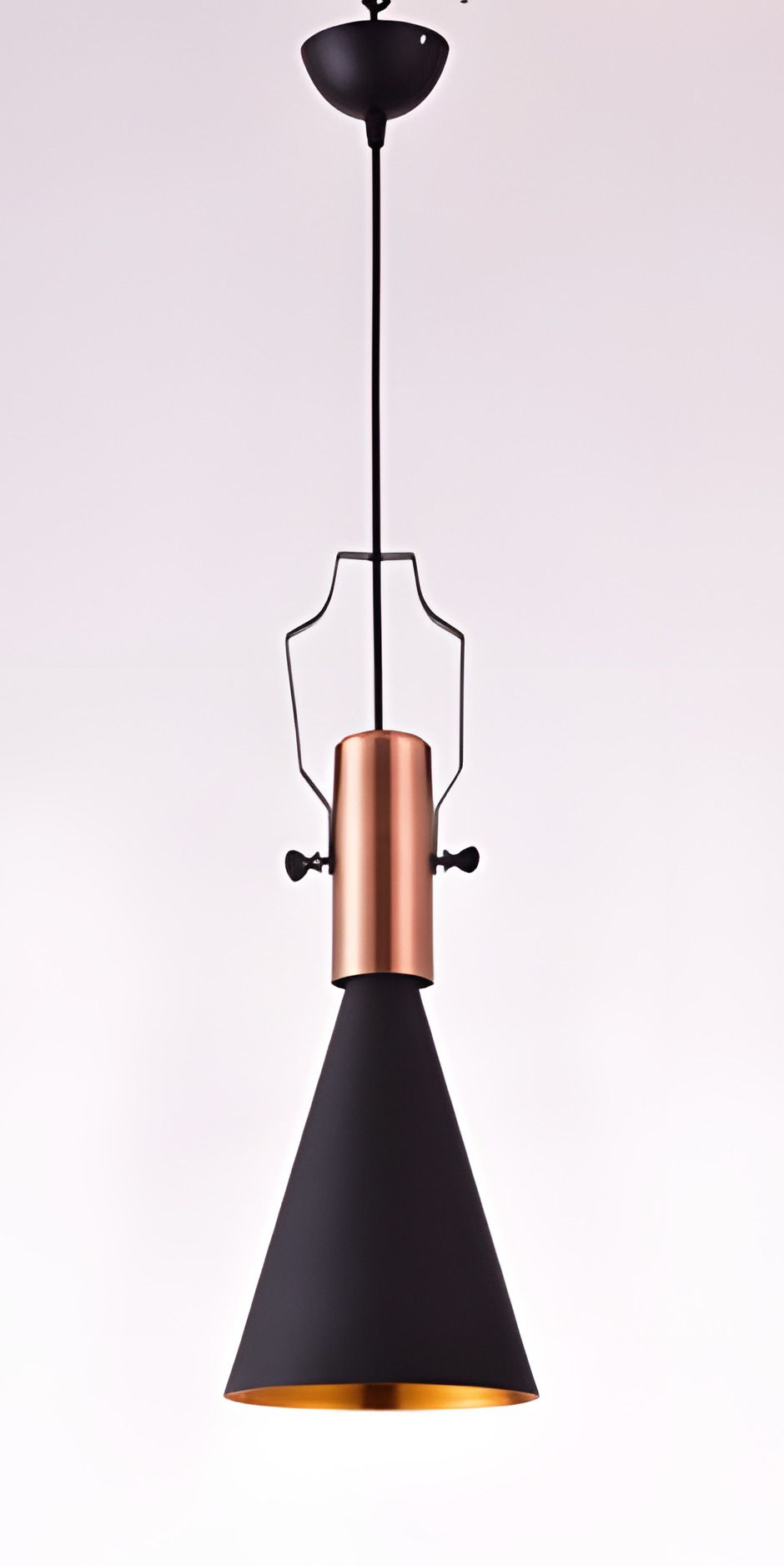 Люстра Sirius имеет одинарный подвес черного цвета, что придает изысканности и контрасту к дизайну. Плафон люстры представляет собой конусную форму и выполнен в черном цвете с медным элементом. Это сочетание цветов придает изяществу и элегантности люстру. Конусный плафон устремляет свет книзу, создавая приглушенное и акцентированное освещение.