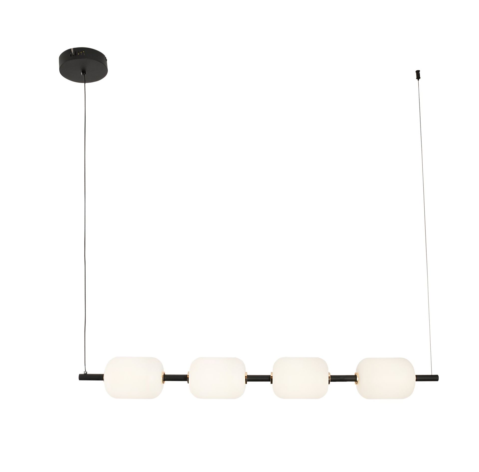 Элегантная чёрная люстра с металлическим каркасом и четырьмя стеклянными плафонами станет стильным акцентом в любой комнате. Ее минималистичный вид гармонично дополнит современный интерьер гостиной, кухни или офиса.