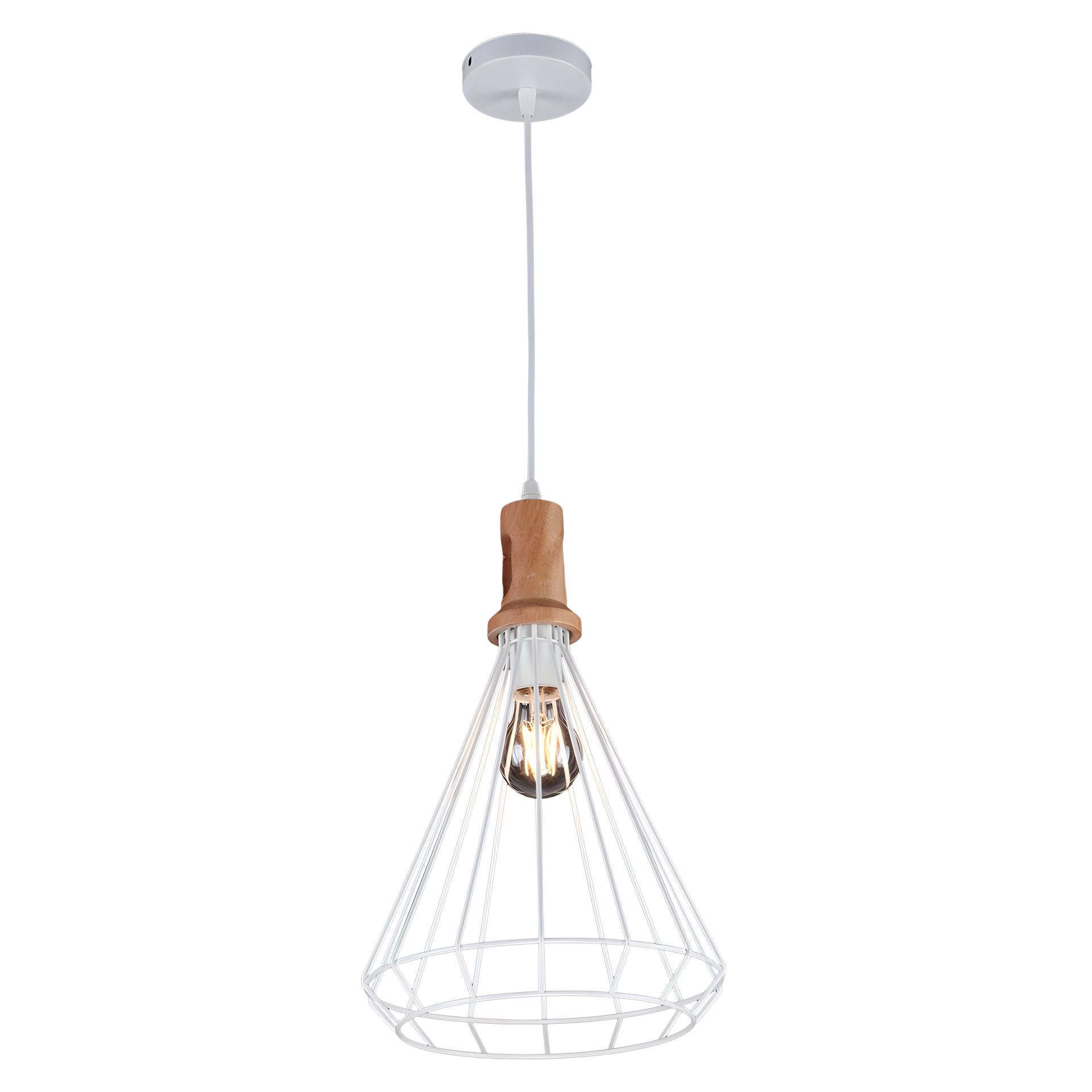 Подвес изготовлен из металла и имеет элементы дерева, что придает светильнику теплый и натуральный вид. Белый цвет металлической части придает современности и стильности.
