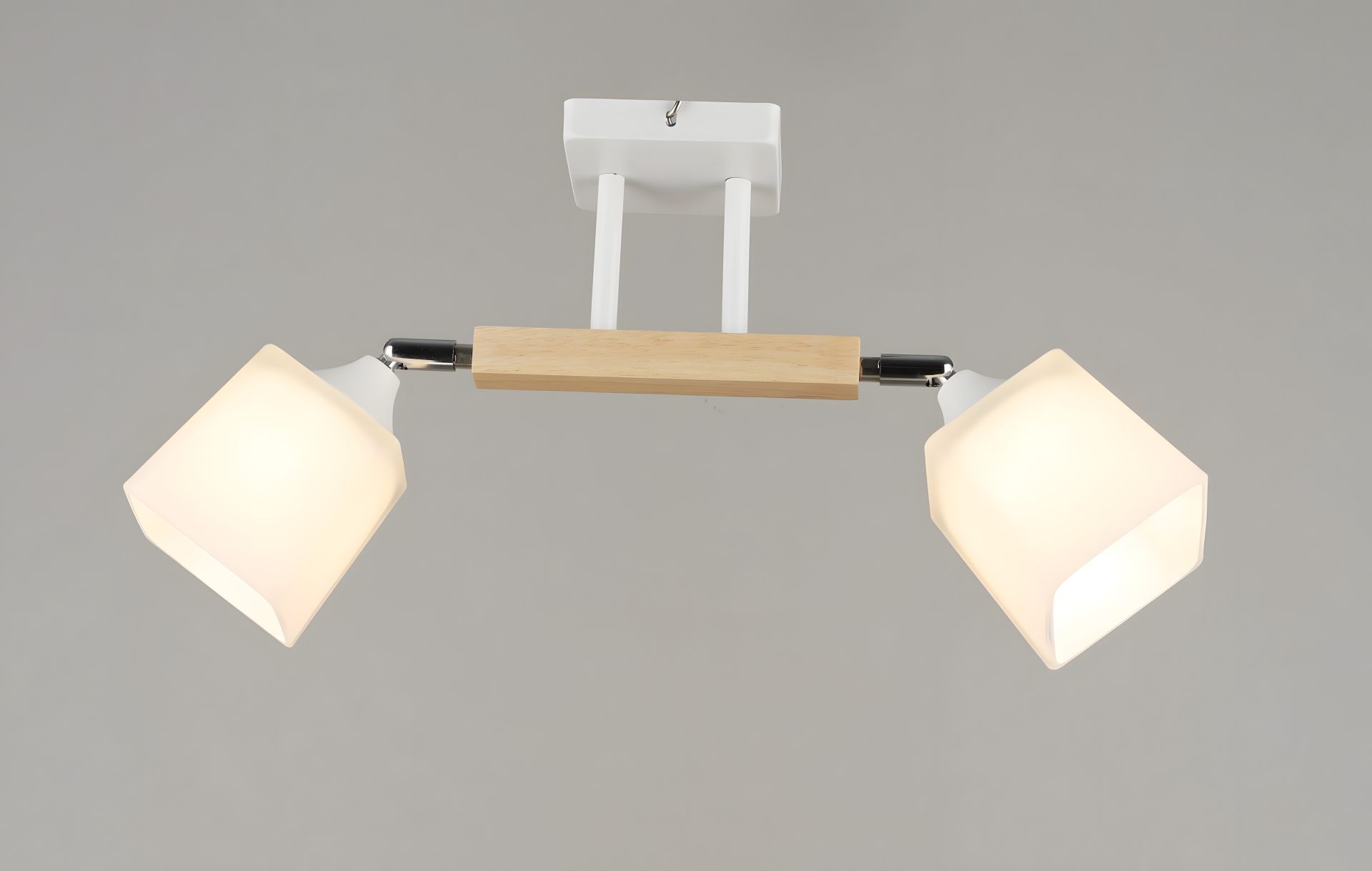 С длиной 500 мм, шириной 100 мм и высотой 240 мм, эта люстра имеет каркас из металла, сочетающий в себе белый и хромовый цвет. Ее 2 плафона поворотной квадратной формы изготовлены из стекла белого цвета и могут быть настроены так, как вам нужно. Цоколь E27 позволяет использовать лампочки мощностью до 60 Ватт.