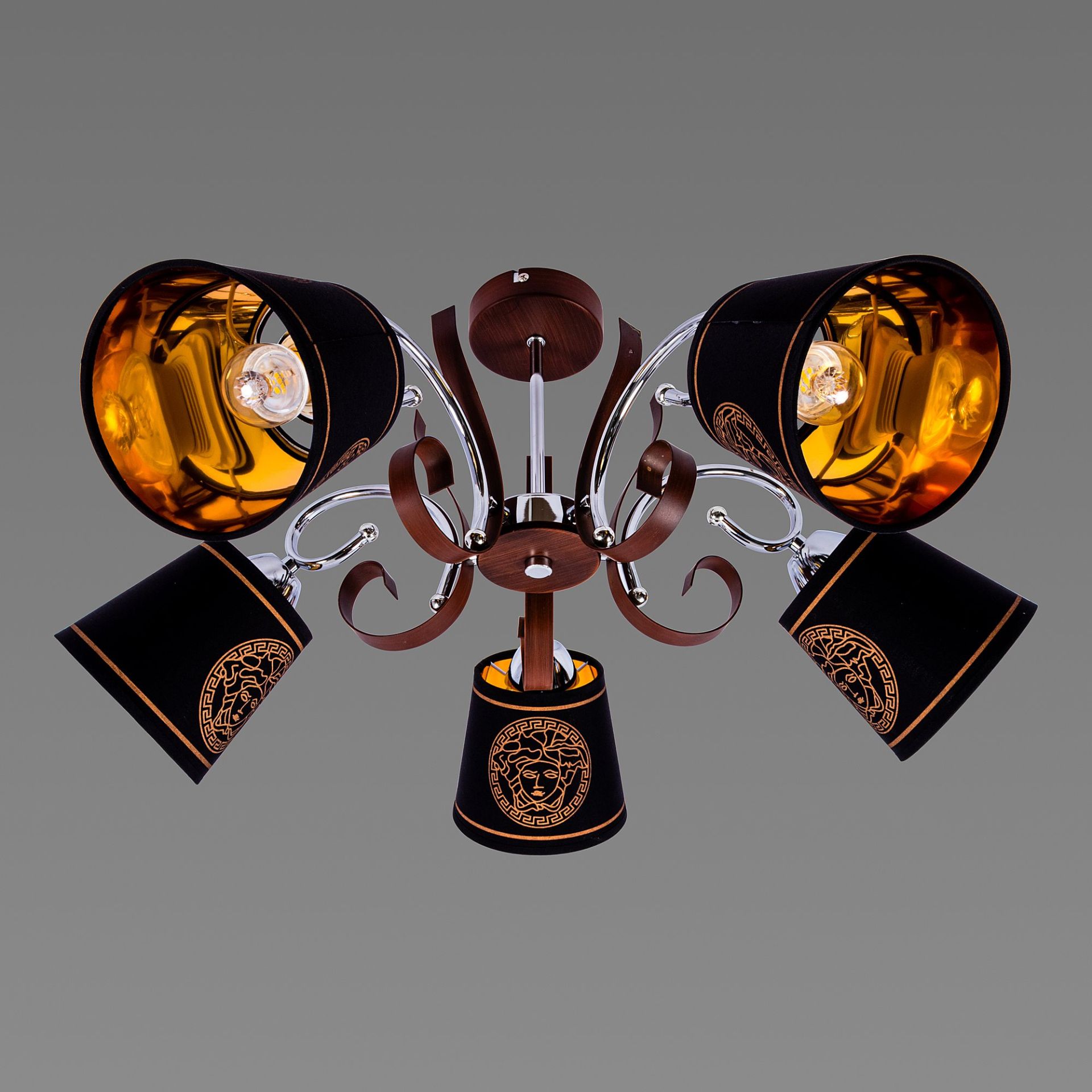 Пять плафонов из черного цвета текстиля рассеивают свет равномерно по всей комнате, создавая атмосферу тепла и уюта. С цоколем Е27, вы можете использовать лампочки до 60 Ватт, включая энергосберегающие LED или накаливание.