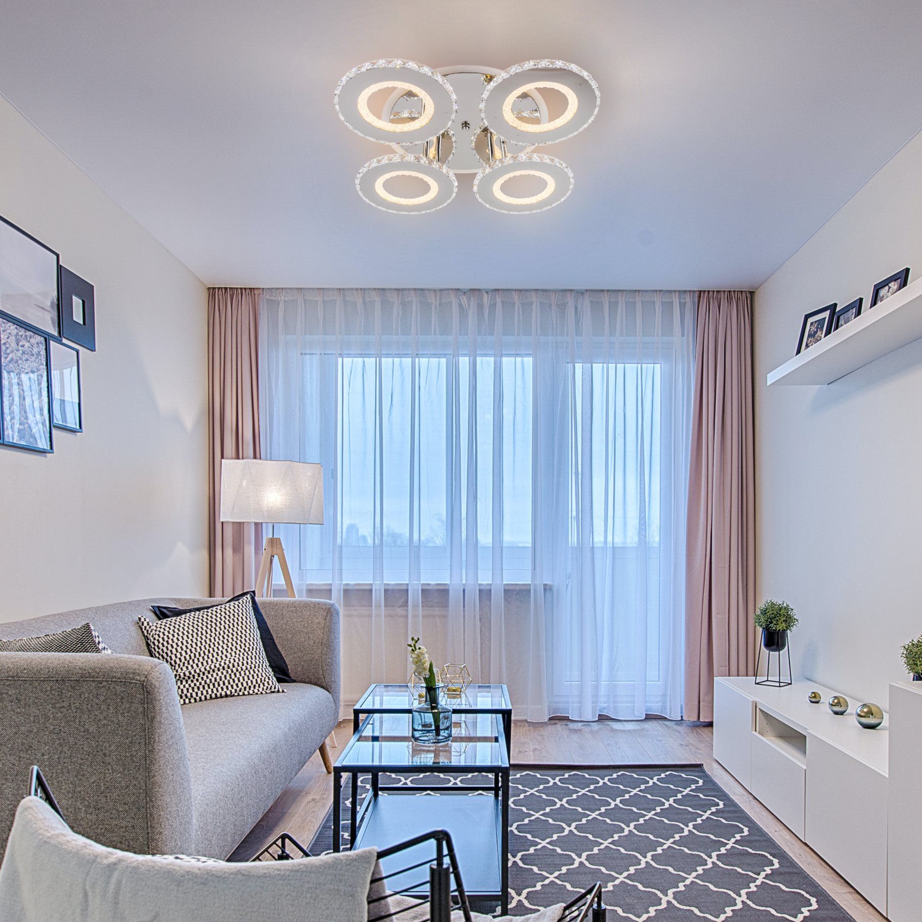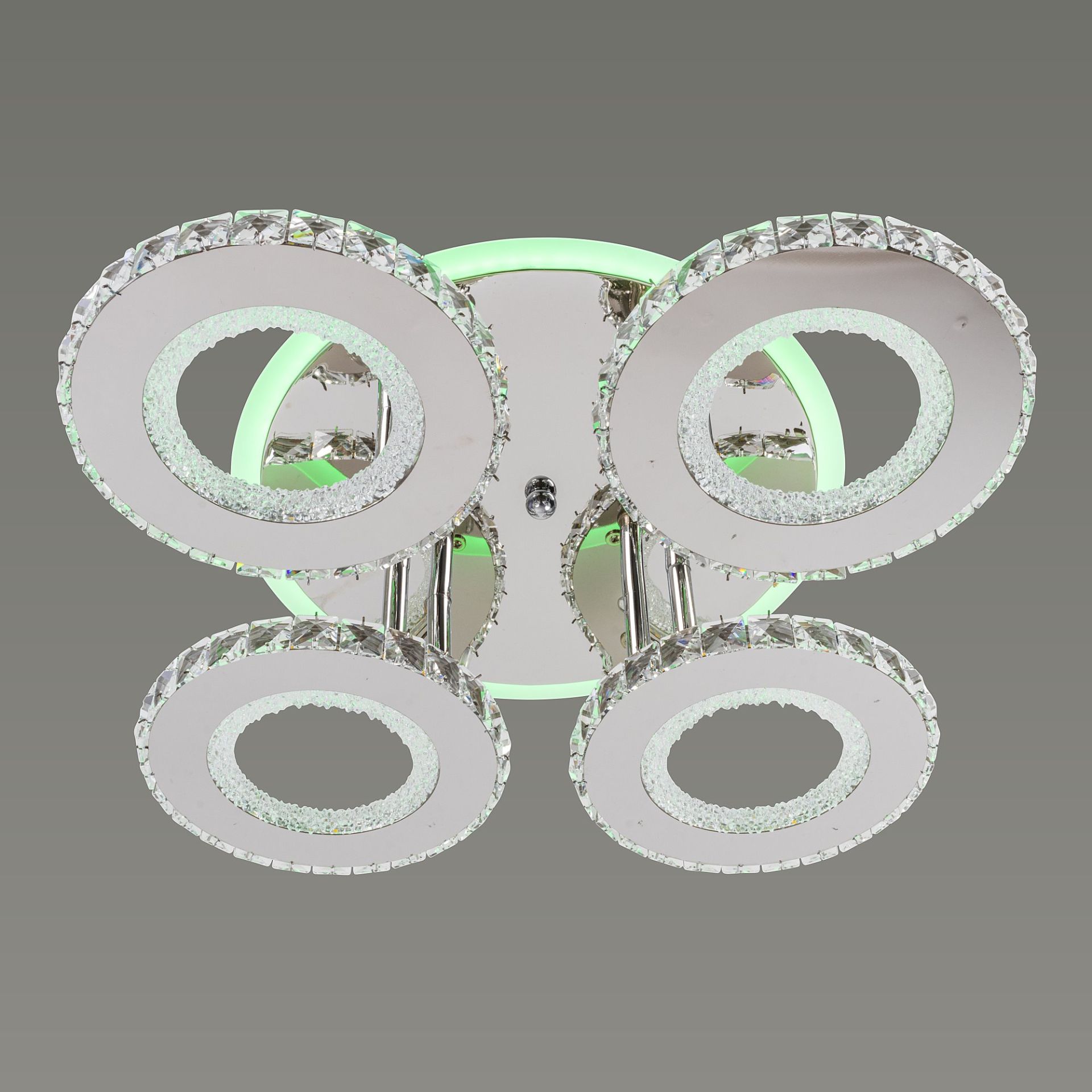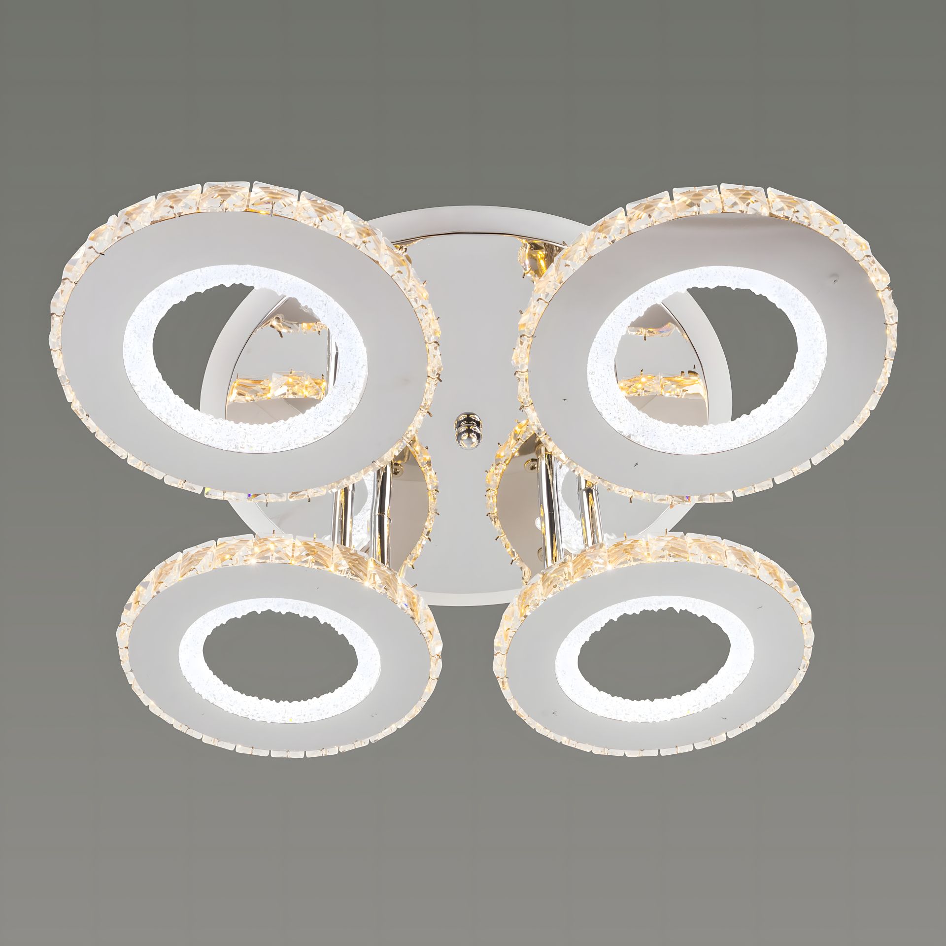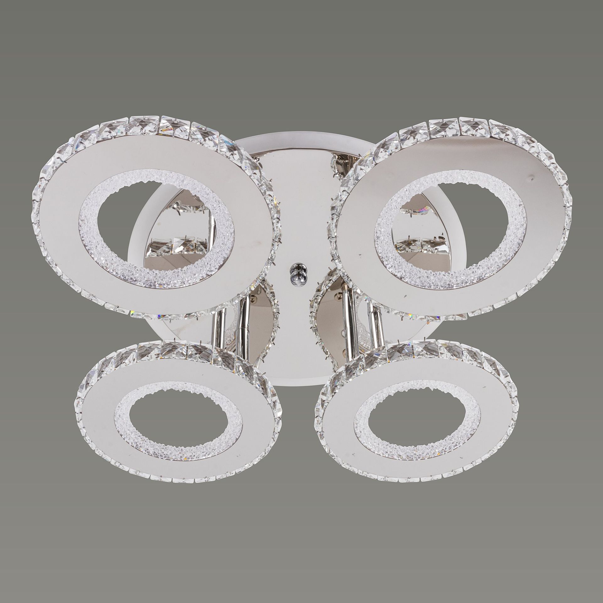 Люстра имеет форму 4 колец, что придает ей уникальный и современный вид. Этот дизайн создает гармоничную композицию и обеспечивает равномерное распределение света по помещению. Каждое кольцо изготовлено из акрила, придающего стильный свет и блеск.