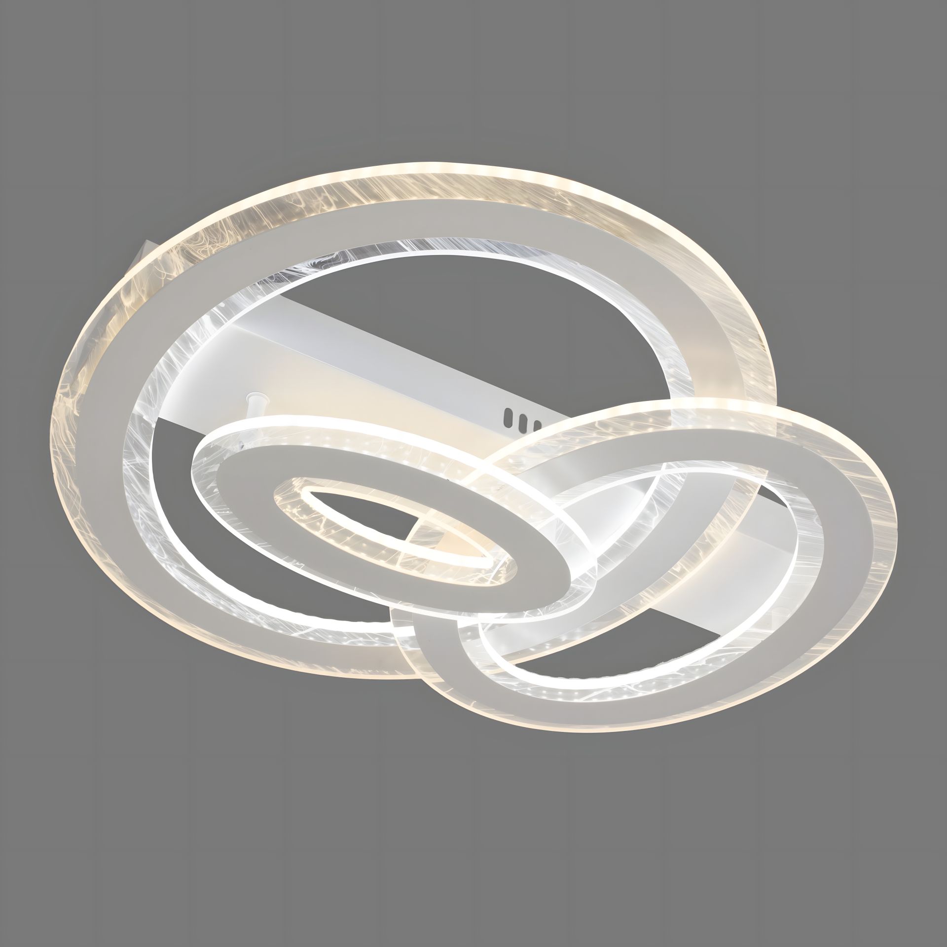 Три круглых плафона из акрила в разных формах создают обаяние и выразительность света. С 186 Ватт и встроенным пультом для регулировки цветовой температуры от теплого до холодного, эта люстра гарантирует качественное и адаптивное освещение.