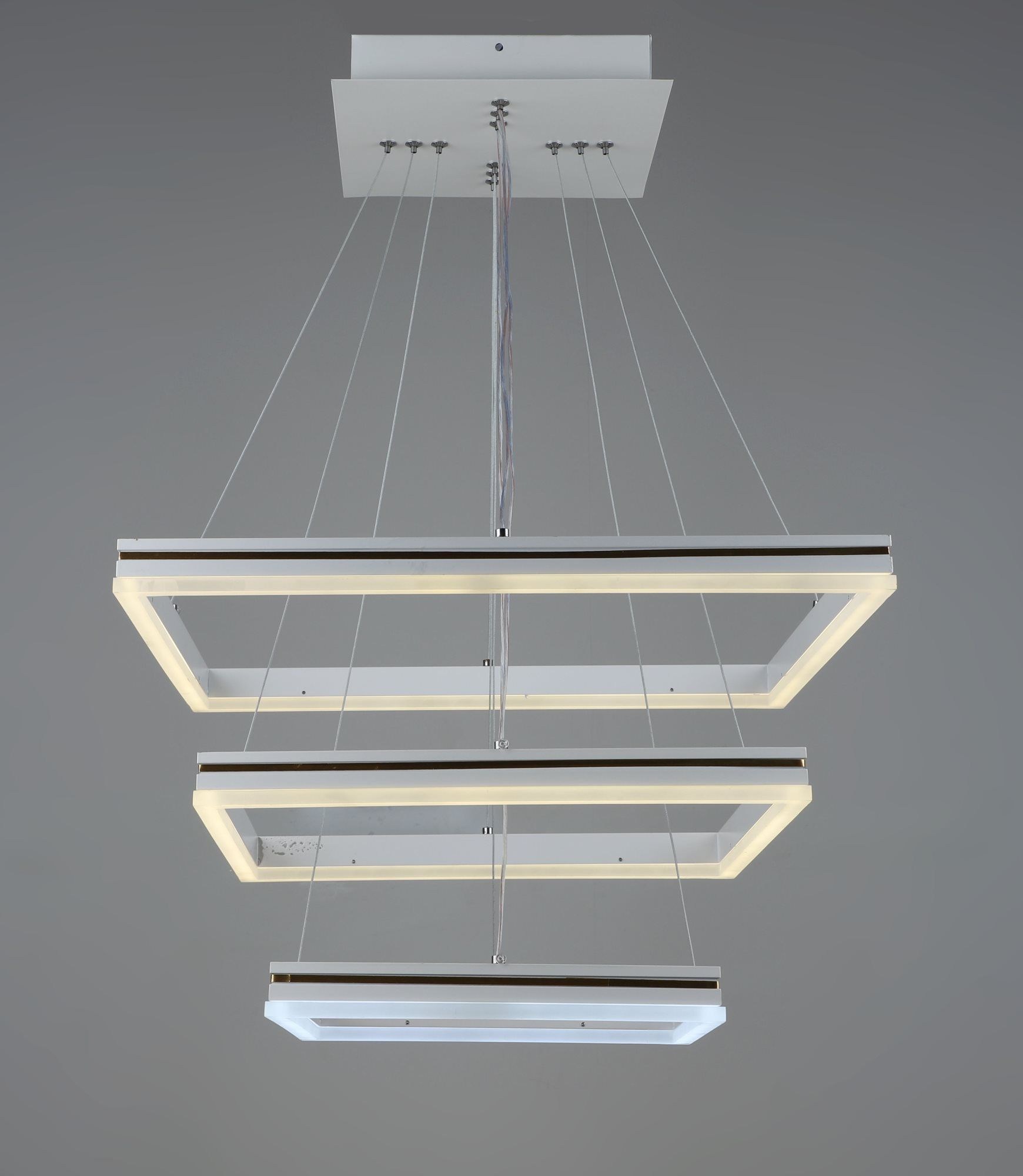 Люстра состоит из трех белых плафонов квадратной формы, свисающих один за другим, придав динамичности и интересному виду вашему интерьеру. Они изготовлены из акрила, что позволяет равномерно распределять свет и создавать приятную атмосферу в помещении.