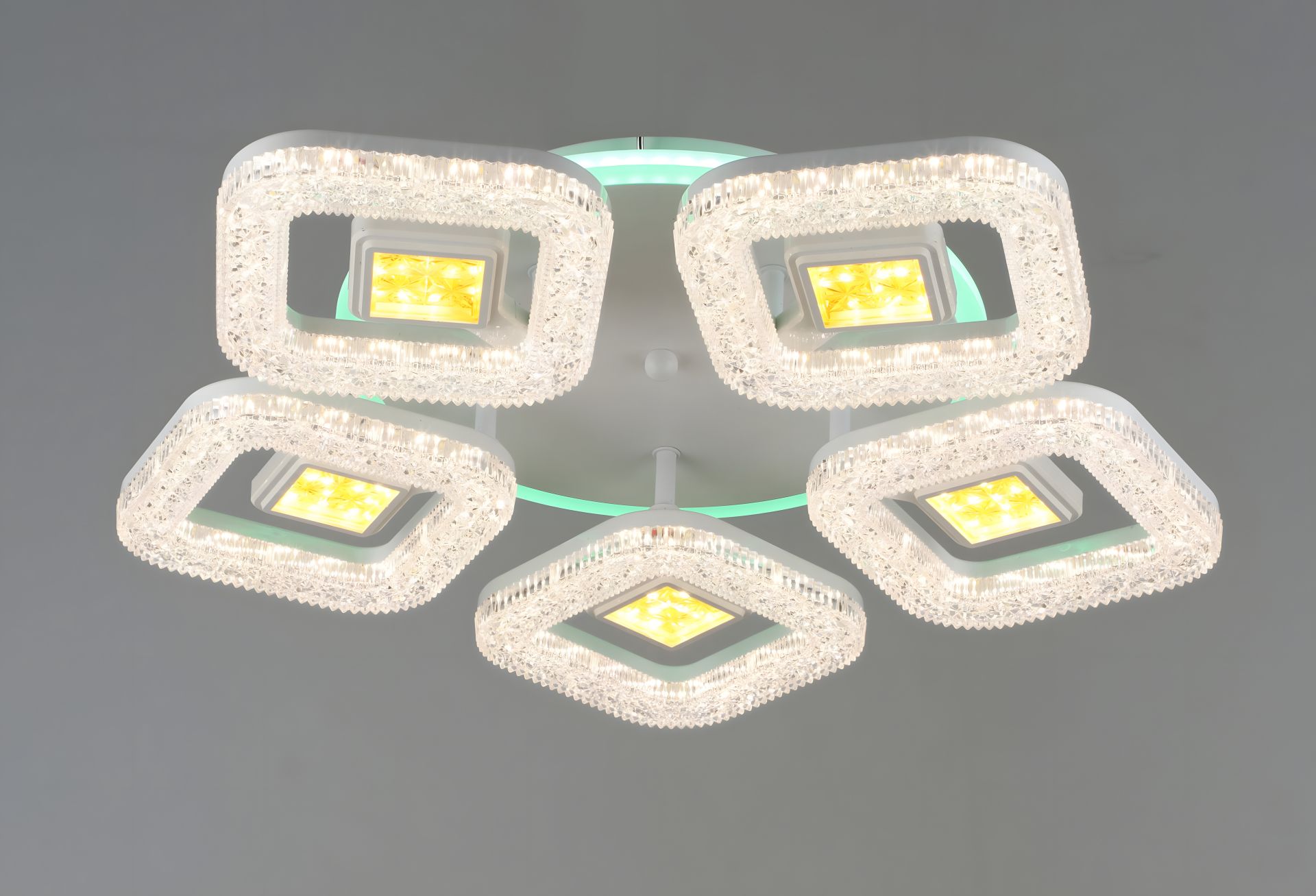Люстра имеет форму пяти квадратов белого цвета, что придает ей современный и стильный вид. Каждый квадрат изготовлен из акрила и имеет гладкую поверхность, что создает эффектный визуальный элемент и рассеивает свет равномерно по помещению.