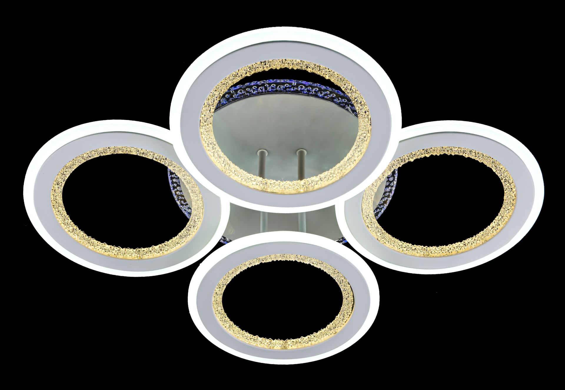 Люстра имеет четыре плафона в форме колец, создающих особый световой эффект, рассеивая свет мягко и равномерно. Эти плафоны выполнены в белом цвете, что придает люстре свежести и легкости в дизайне.