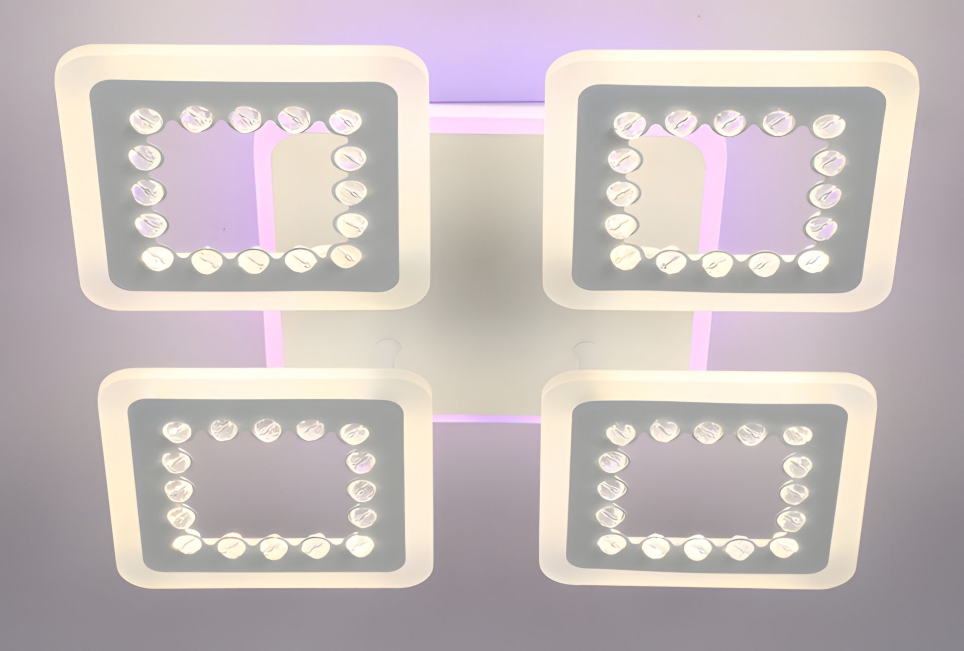 Характеризуя данную люстру, первое, что стоит отметить, это ее четыре плафона квадратной формы из акрилового материала. Такой дизайн отлично вписывается в современный интерьер и создает чистый, современный образ. Белый цвет придает контрасту и элегантности, делая эту люстру стильным акцентом в помещении. Размер люстры длина 560мм, ширина 560 мм, высота 80мм.