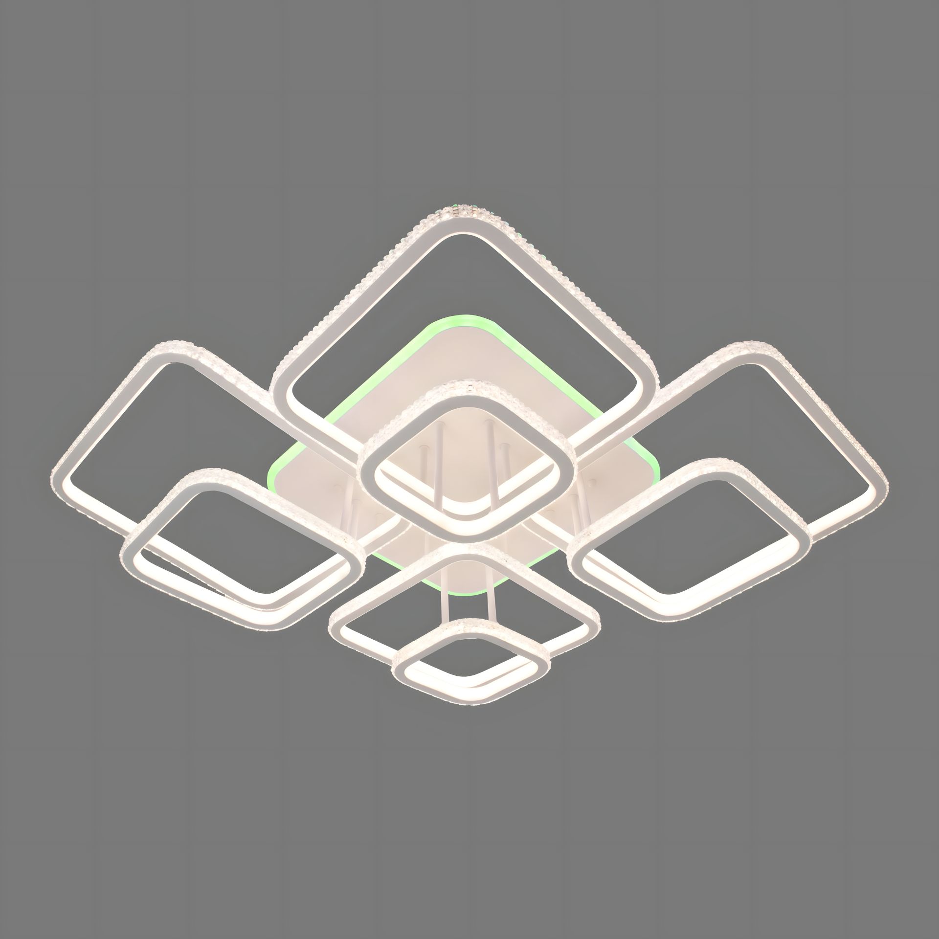 Эта акриловая люстра поражает своими большими размерами – длина 1120 мм, ширина 850 мм и высота 200 мм, что придает ей роскошный и эффектный вид. Она имеет 8 плафонов квадратной формы, что придает современности и стильности дизайн.