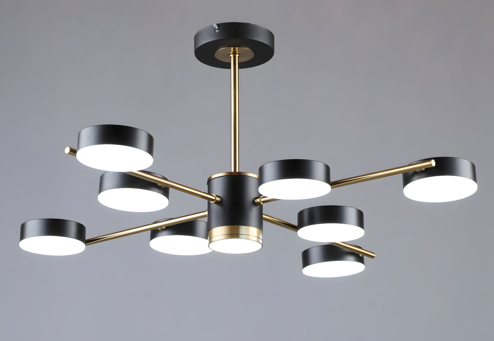 Каркас изготовлен из прочного черного и позолоченного металла, что придает люстру современный стиль лофт. Восемь круглых плафонов, изготовленные из акрила, равномерно распределяют свет, создавая уютную атмосферу.