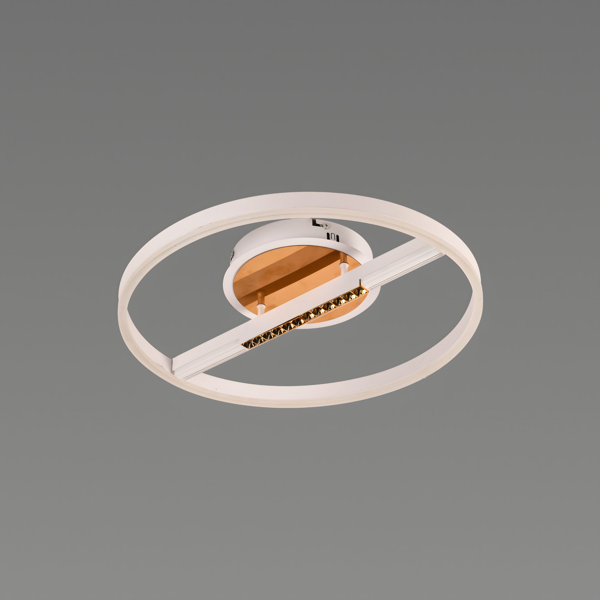 Каркас люстры изготовлен из высококачественного белого металла с элегантными золотыми акцентами. Акриловый плафон, выполненный в форме круга, придает изделию современного шарма и обеспечивает равномерное рассеяние света.