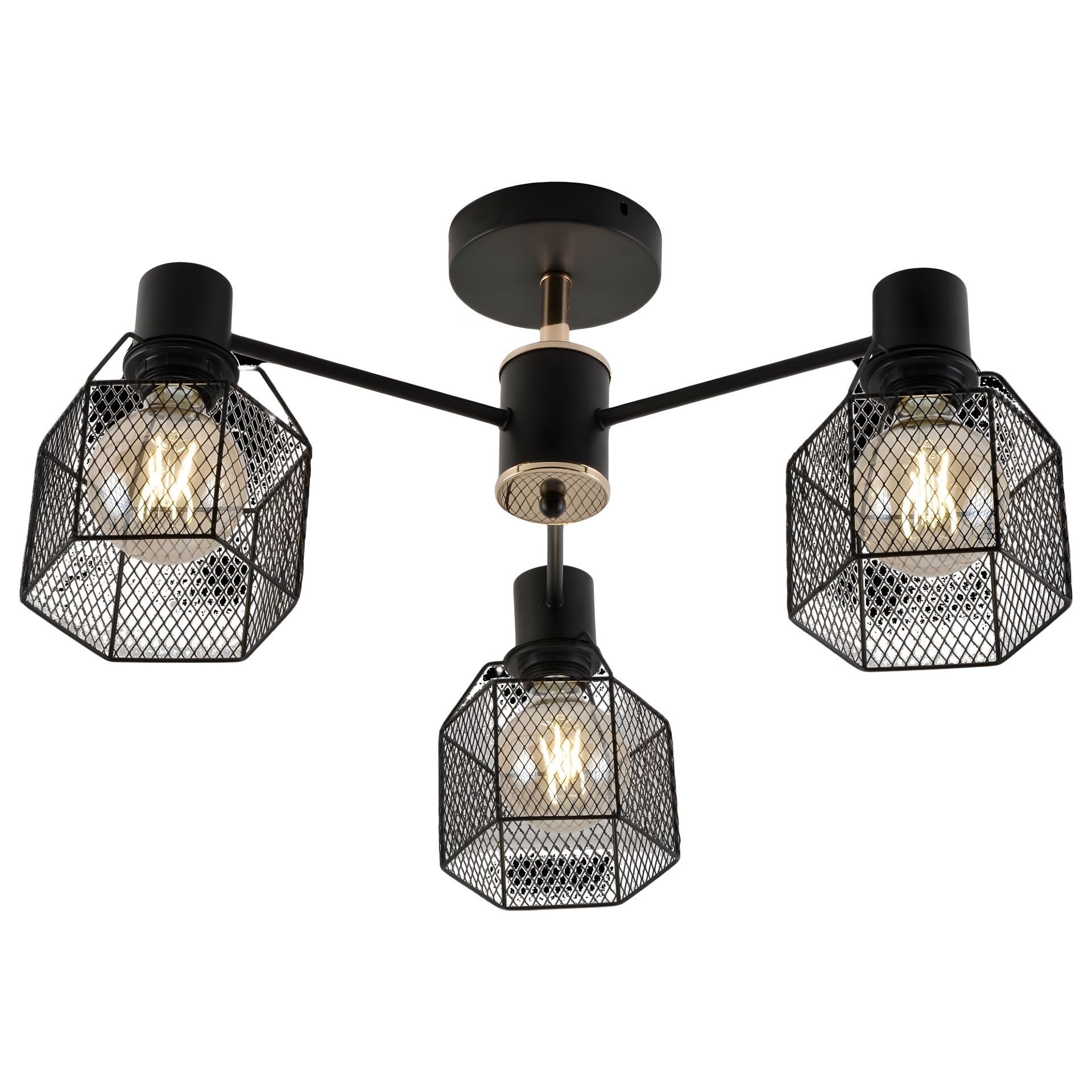 Каркас, изготовленный из металла в черном и позолоченном цвете, придает этому люстру уникальный шарм и изысканность. Три плафона из металлической тонкой сеточки добавляют дополнительный изысканный акцент, создавая игру света в помещении.