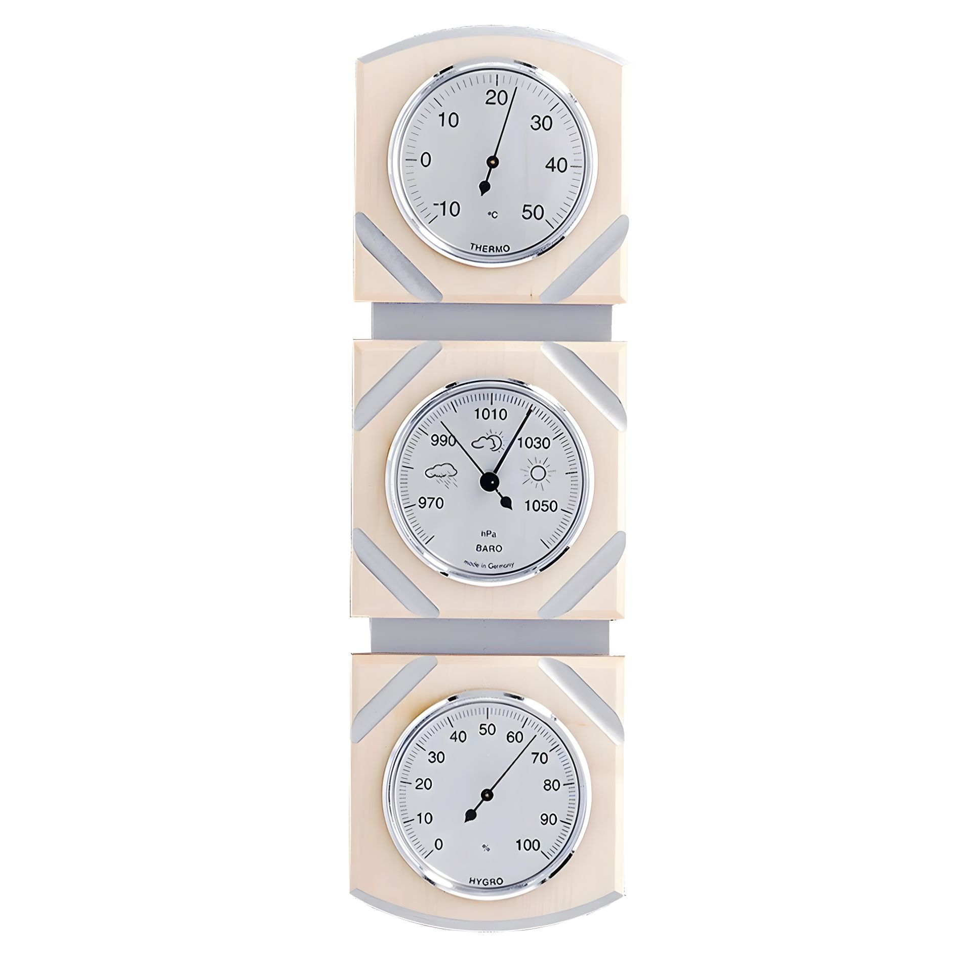 Настенная метеостанция Moller 203192 Maple состоит из барометра, гигрометра и термометра одинаковых диаметров с большими циферблатами под цвет серебра в деревянных корпусах, объединенных на общей деревянной основе цвета серебра. Вся продукция Moller производится из твердых пород дерева, а именно из бука, поверхность шлифуется, после чего корпус покрывается специальными составами лака для придания необходимой долговечности, цвета и текстуры древесины. Барометры Moller адаптированы для нашего рынка и имеют шкалу не только в гектопаскалях, но и в миллиметрах ртутного столба. Качество и надежность Moller подкреплены пятилетней гарантией.