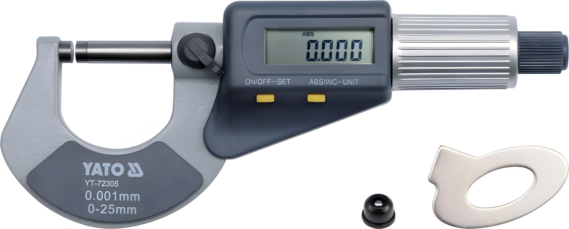 Цифровой микрометр YATO YT-72305 — ручной инструмент, предназначенный для измерений линейных размеров деталей в области малых размеров с высокой точностью, оснащен ЖК-дисплеем, на который выводятся значения. Прибор имеет диапазон измерения от 0 до 25 мм.