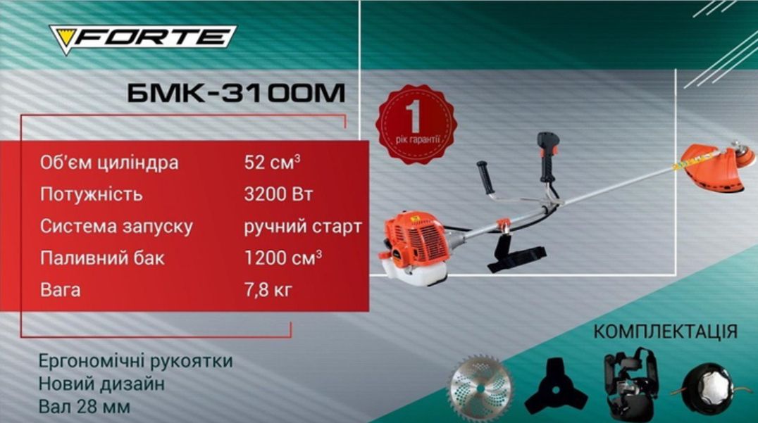 Forte БMK-3100М — это мощная и надежная бензиновая мотокоса для ухода за газонами, садом и участками с плотной растительностью. Благодаря высокой мощности и продуманной конструкции, коса обеспечивает отличную производительность и комфорт при длительной работе. Станет отличным помощником как для дачников, так и для коммунальных служб.