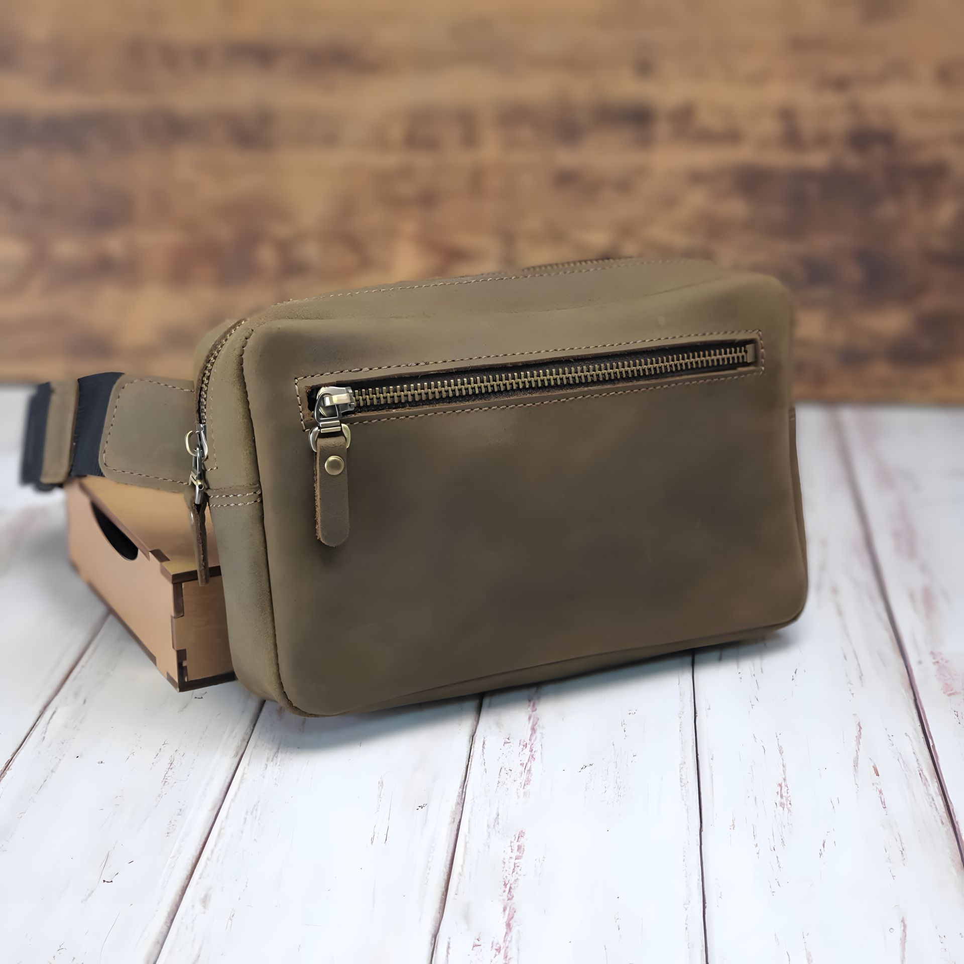 Мужская сумка-бананка из винтажной кожи Crazy Horse - идеальное решение для тех, кто ценит комфорт и стиль в повседневной жизни. Плотная и прочная кожа обеспечивает долговечность изделия, а ее оливкоовый оттенок придает сумке элегантный внешний вид.