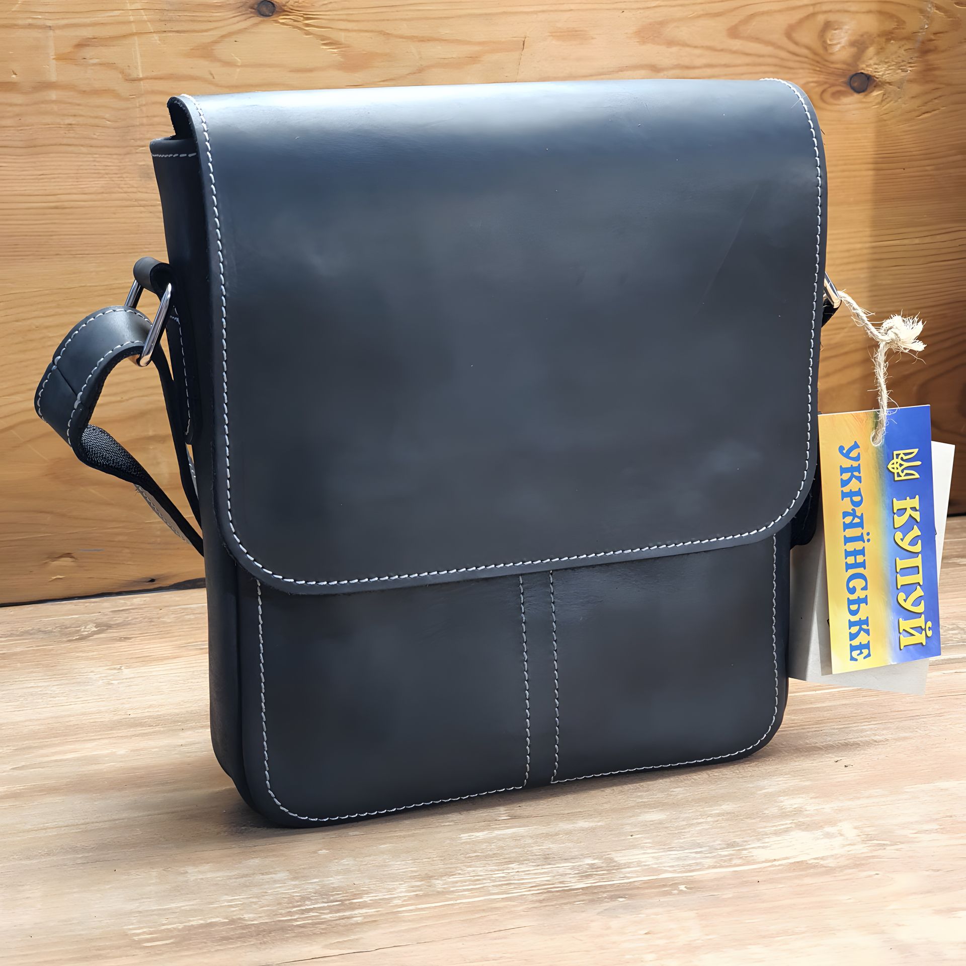 Мужская повседневная сумка от украинского производителя GS. Пошита из натуральной, вощеной кожи КРС Crazy Horse. В сумке одно основное отделение шириной 5 см. В нем есть потайное отделение с молнией и небольшой карман для документов или ключей. Спереди, под клапаном большой карман с молнией. Основное отделение закрывается качественной металлической молнией. Вся сумка закрывается клапаном на магнитных кнопках. Ремень через плечо ( 150 см) обшит кожей и регулируется по длине.