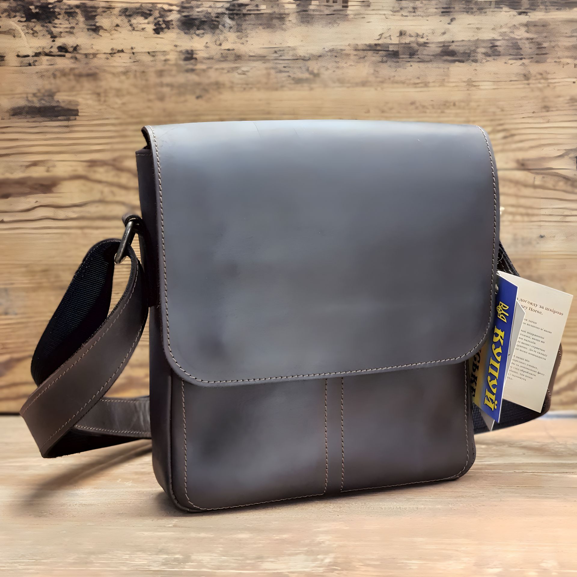 Мужская повседневная сумка от украинского производителя GS. Пошита из натуральной, вощеной кожи КРС Crazy Horse. В сумке одно основное отделение шириной 5 см. В нем есть потайное отделение с молнией и небольшой карман для документов или ключей. Спереди, под клапаном большой карман с молнией. Основное отделение закрывается качественной металлической молнией. Вся сумка закрывается клапаном на магнитных кнопках. Ремень через плечо ( 150 см) обшит кожей и регулируется по длине.