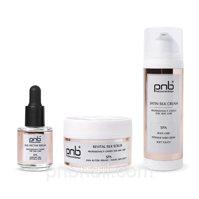 СПА набір Шовкова розкіш від PNB - унікальна серія доглядових продуктів зі СПА ефектом, які не тільки замінять салонні процедури, але й забезпечать регулярний та ефективний догляд за шкірою рук. Улюблені засоби для догляду за руками — тепер у міні-форматах, щоб краса й турбота були завжди поруч. Продукти у міні-форматі ідеально поміщаються в сумочку або тревел-кейс — можна брати з собою в подорож, на роботу чи просто мати під рукою протягом дня. Мʼяке очищення, делікатне зволоження, шовкова ніжність — усе, що потрібно рукам, щоб відчувати себе доглянутими, навіть у найбільш насичений день. Набір включає: Revital Silk Scrub PNB, 50 мл – ніжний цукровий скраб, що сприяє дбайливому відшелушуванню ороговілого шару шкіри, роблячи руки гладкими і приємними на дотик, а також насичує їх вітамінами та мікроелементами. Антиоксидантні та антивікові властивості скрабу роблять його універсальним та незамінним помічником у догляді за шкірою рук. Розкішний аромат та текстура продукту створюють СПА ефект. Silk Nectar Serum PNB, 15 мл – сироватка-концентрат для сяйва та відновлення шкіри. Вона значно покращує стан шкіри рук, забезпечує сяйво, підвищує тонус, зменшує кількість зморшок. Має високу концентрацію активних компонентів, які працюють в глибоких шарах шкіри. Дія сироватки та крему різна, але вони чудово доповнюють одне одного. Сироватка проникає глибоко в шкіру, а крем захищає її на поверхні. Використовуючи сироватку Silk Nectar Serum PNB перед нанесенням крему, Ви забезпечуєте глибоке живлення, регенерацію та розгладження шкіри рук. А корисні олії, вітаміни та емоленти роблять її мʼякою та сяючою зсередини. Satin Silk Cream PNB, 50 мл – легкий доглядовий крем, який зволожує, захищає шкіру від втрати вологи та підтримує протягом дня, відновлює гідратацію, регенерує, створює захисну плівку, робить шкіру рук м'якою і гладенькою. Забезпечує надійну роботу сироватки в глибоких шарах шкіри. Продукт створює ефект оксамитових рук, наповнених та зволожених зсередини. Переваги СПА набору Шовкова розкіш PNB: