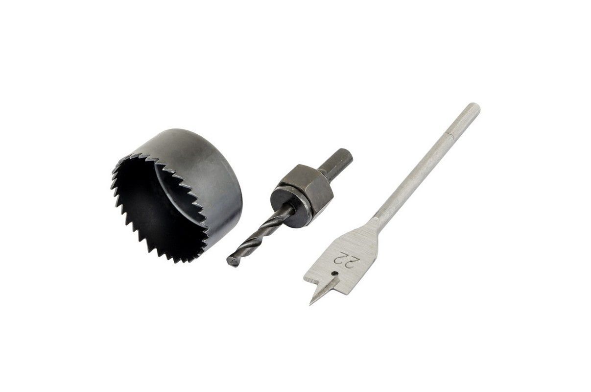 Набор для установки замков 3 эл. – универсальный комплект для быстрого и удобного монтажа врезных замков в деревянные двери. В набор входят кольцевое сверло-коронка для высверливания отверстий под замок, специальное сверло для отверстия под ручку и кондуктор/направляющая для точной разметки и сверления. Изготовленный из прочных материалов, набор обеспечивает точность, чистоту обработки и значительно упрощает процесс установки замков даже для начинающих мастеров. • кольцевая фреза 54 мм