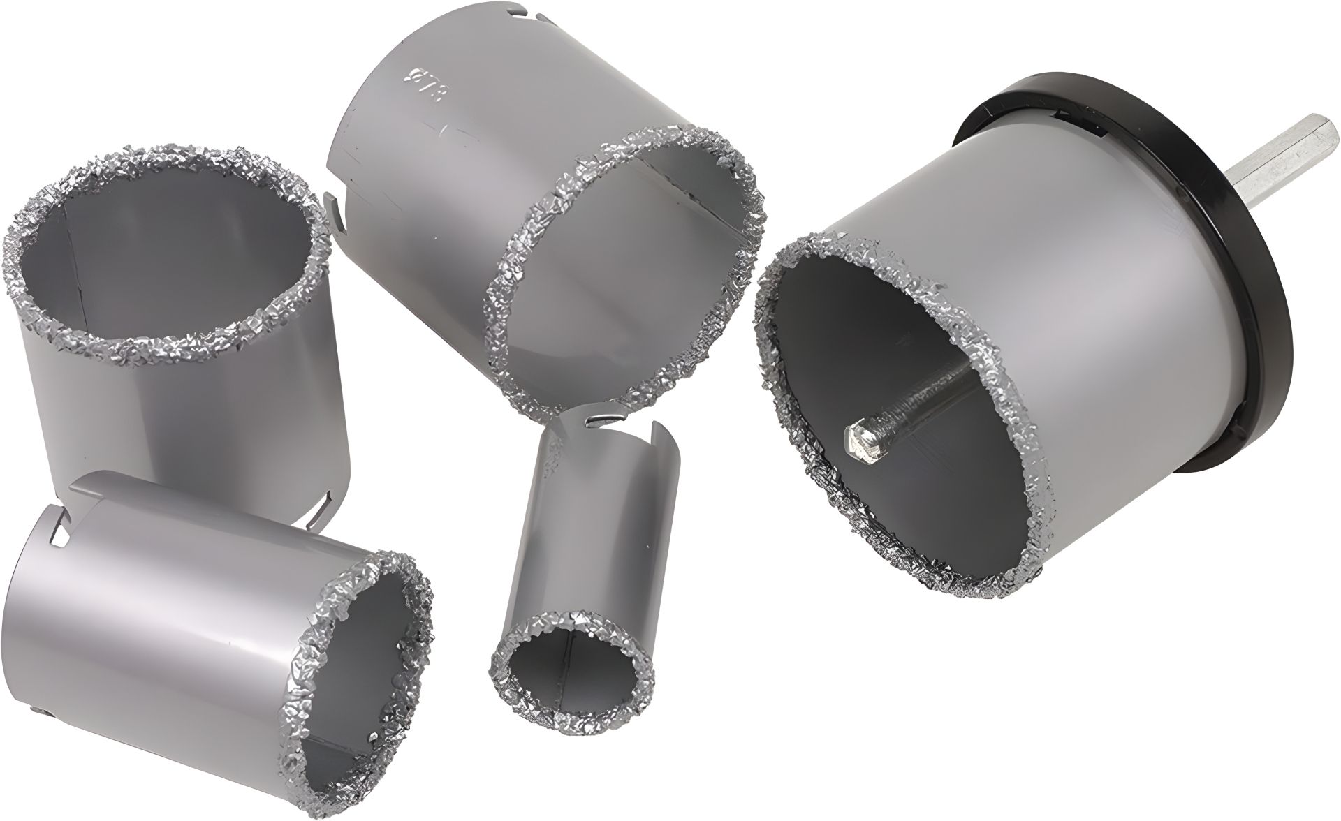 Фрезы корончатые с твердосплавной режущей кромкой из карбида вольфрама используются для сверления отверстий в бетоне, кирпиче, дереве, изразцах, гипсовых плитах, керамической плитке, пластмассе. Максимальная глубина реза ≈ 55 мм. В состав набора входят фрезы, корончатый держатель и центрирующее сверло.
