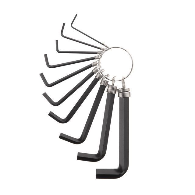10 метрических шестигранных ключей размещаются на персональных держателях в виде брелка, набор удобно хранить, ключи не теряются, также можно положить их в ящик к другим инструментам или подвесить над рабочим столом.