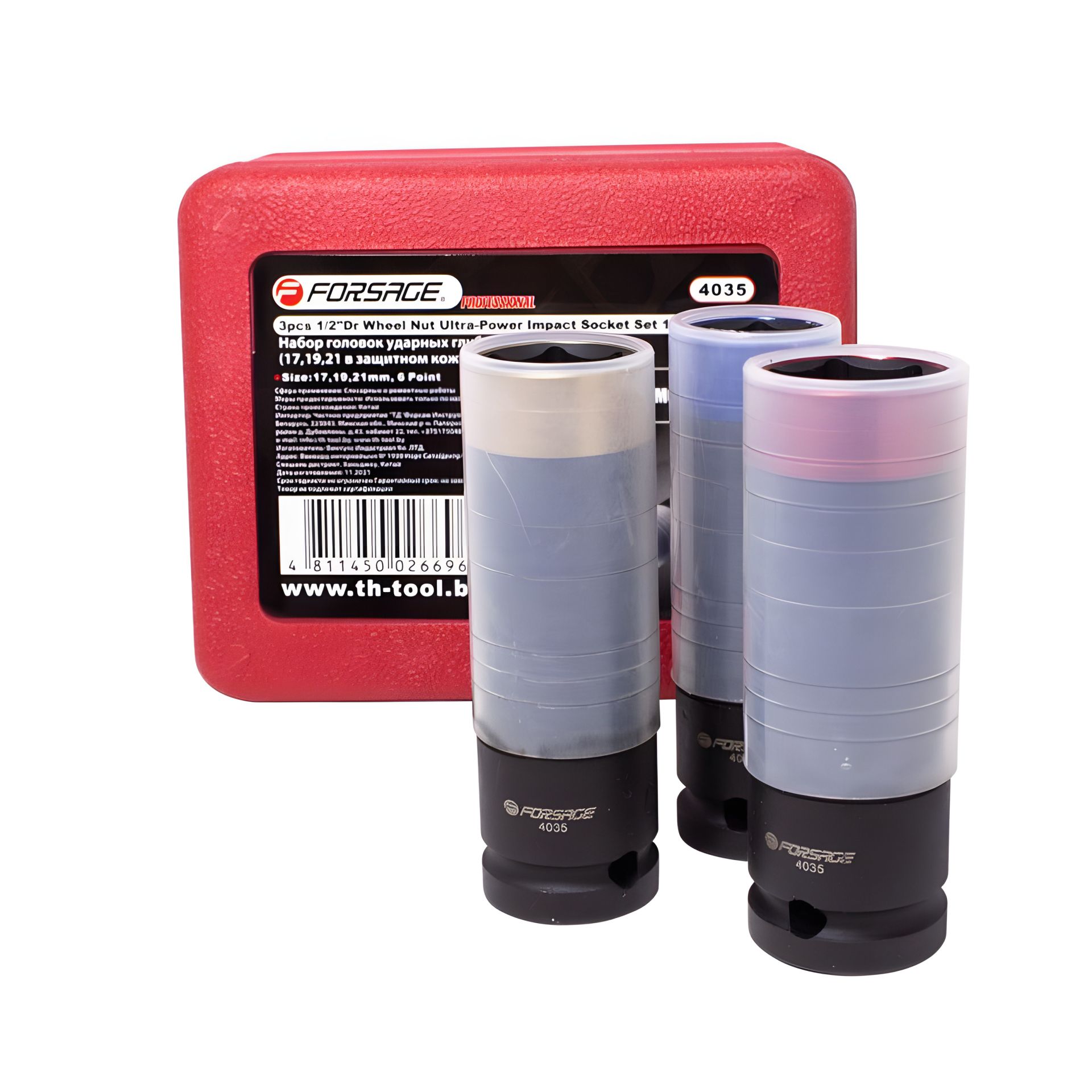 Набор головок ударных глубоких тонкостенных в защитном кожухе, 3 предметов, 1/2'' 6 граней Forsage F-4035 предназначен для работы с колесными гайками на автомобилях. Набор включает в себя три головки размером 17, 19 и 21 мм.