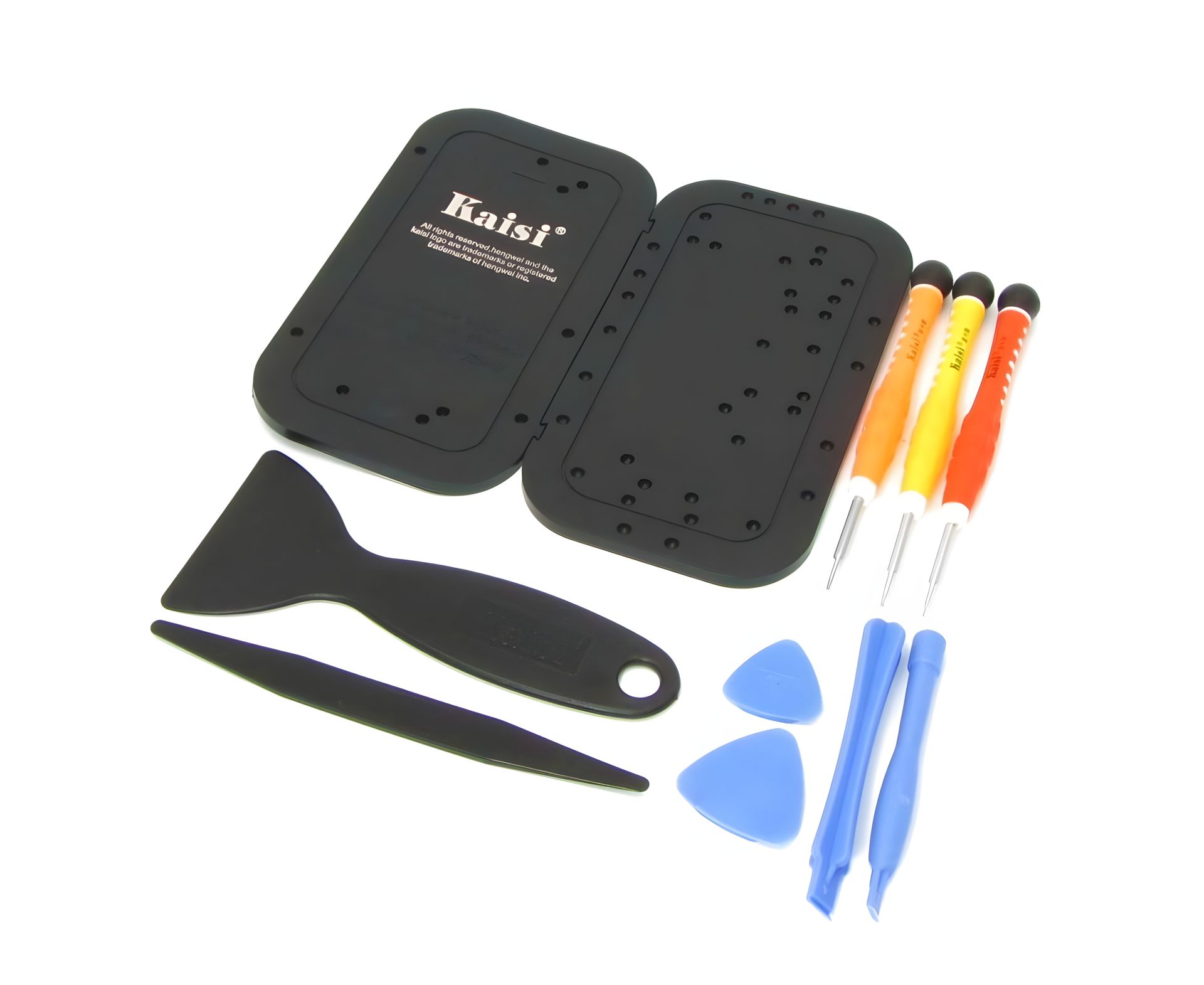 Набор инструментов KAISI 3689 – незаменимый набор инструментов для ремонта и разборки IPhone 5. Компактные размеры набора позволяют носить с собой, не занимая при этом много места. Комплектация: 3 отвёртки; 4 шпателька; 2 медиатора; Подставка для винтов iPhone 5.