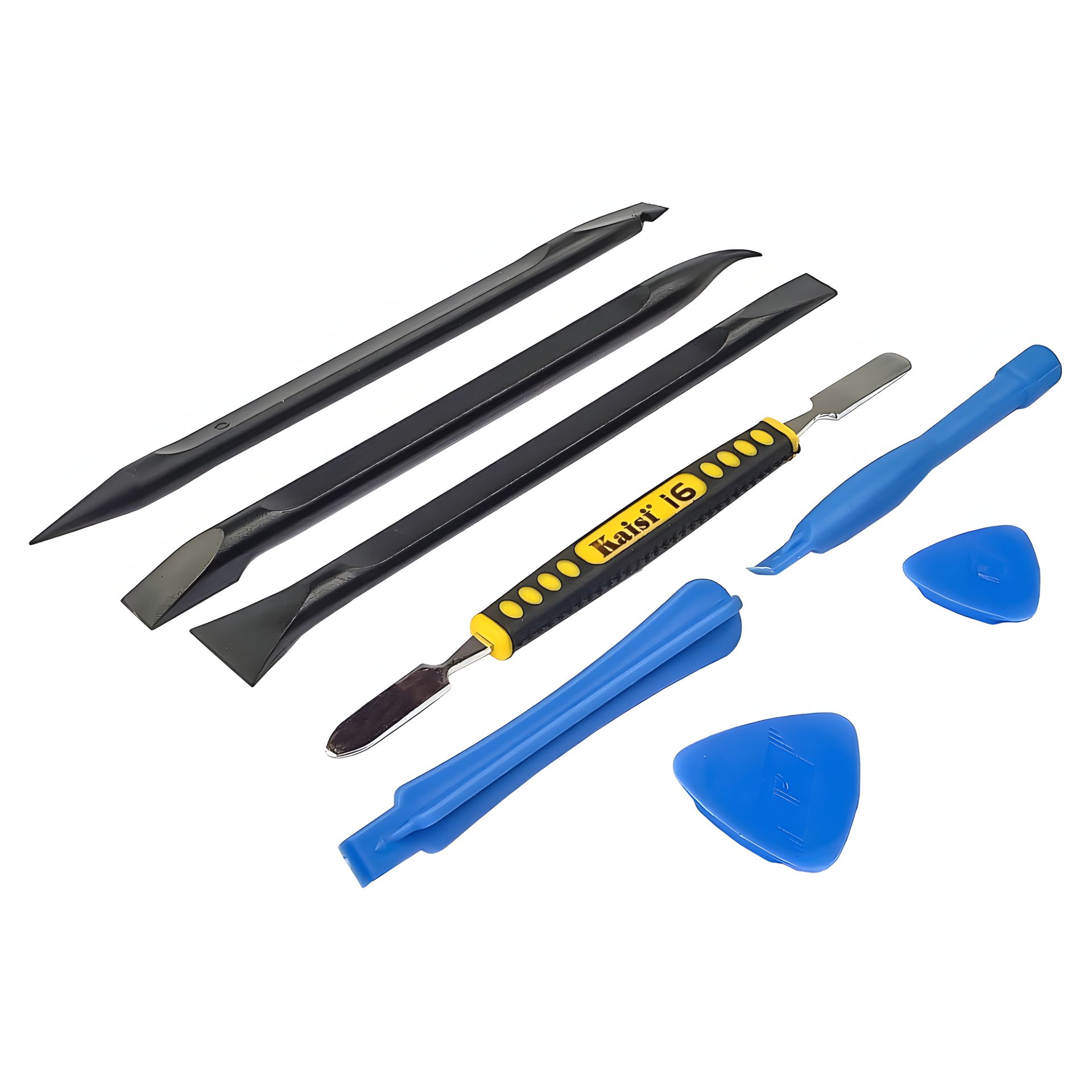 Набор инструментов Kaisi K-X1468 — это универсальный комплект, предназначенный для безопасной разборки и ремонта различных электронных устройств. Включает 6 лопаток и 2 медиатора, изготовленных из углеродного волокна, металла и пластика, что гарантирует прочность, долговечность и удобство работы. Эти инструменты идеально подходят для вскрытия корпусов мобильных телефонов, планшетов, ноутбуков и другой цифровой техники без повреждения деталей.