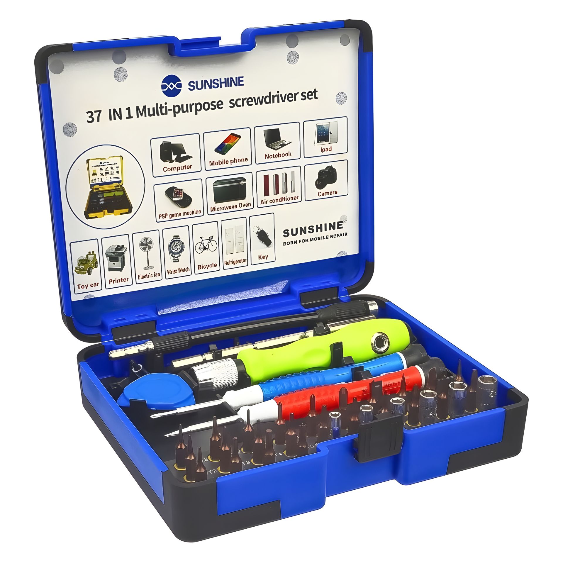 Sunshine SS-5110 – это универсальный набор инструментов, предназначенный для ремонта и обслуживания мобильных телефонов, планшетов, ноутбуков, компьютеров, бытовой техники и других электронных устройств. С его помощью можно легко выполнять разборку, сборку и замену компонентов без повреждений.