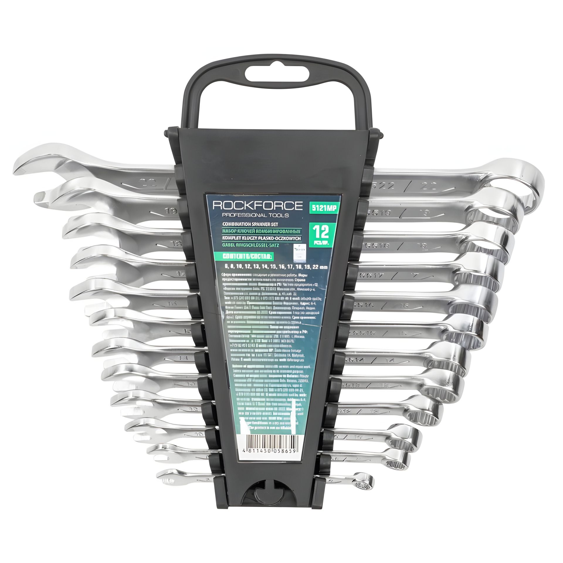 Набор комбинированных ключей ROCKFORCE RF-5121MP из 12 шт. размером от 6 до 22 мм — комплект ручных слесарно-монтажных инструментов из стали CrV, позволяющих закручивать и откручивать гаечные и болтовые соединения. Кольцевой зев каждого ключа имеет 12-гранную рабочую поверхность и крепко удерживает крепеж, не повреждая его. Ключи используются при ремонте автомобилей, сборке техники, будут полезны и в быту.