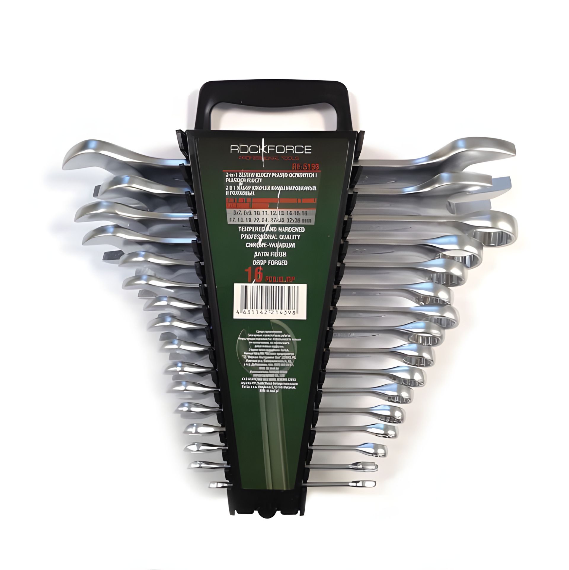Ключей комбинированных и рожковых набор, 16 предметов, в пластиковом держателе ROCKFORCE FORSAGE RF-5199