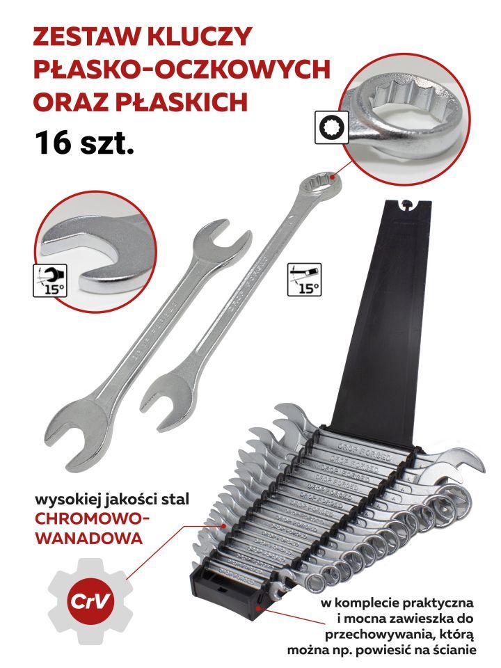 Ключи комбинированные и рожковые из 16 предметов WT-5199 от бренда WMC Tools - ручной инструмент для работы с различными резьбовыми соединениями.