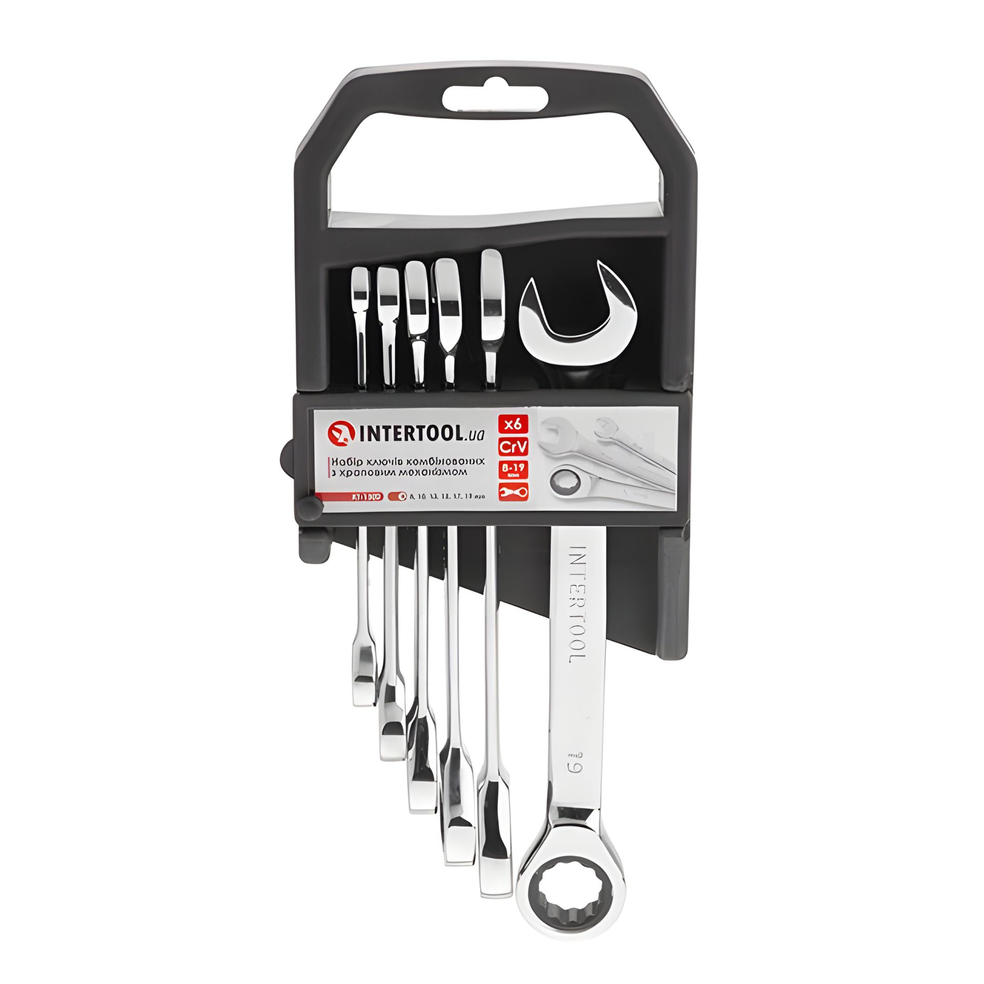 Набор комбинированных ключей с трещоткой 6 шт., 8-19 мм, Cr-V, профессиональный, INTERTOOL XT-1302